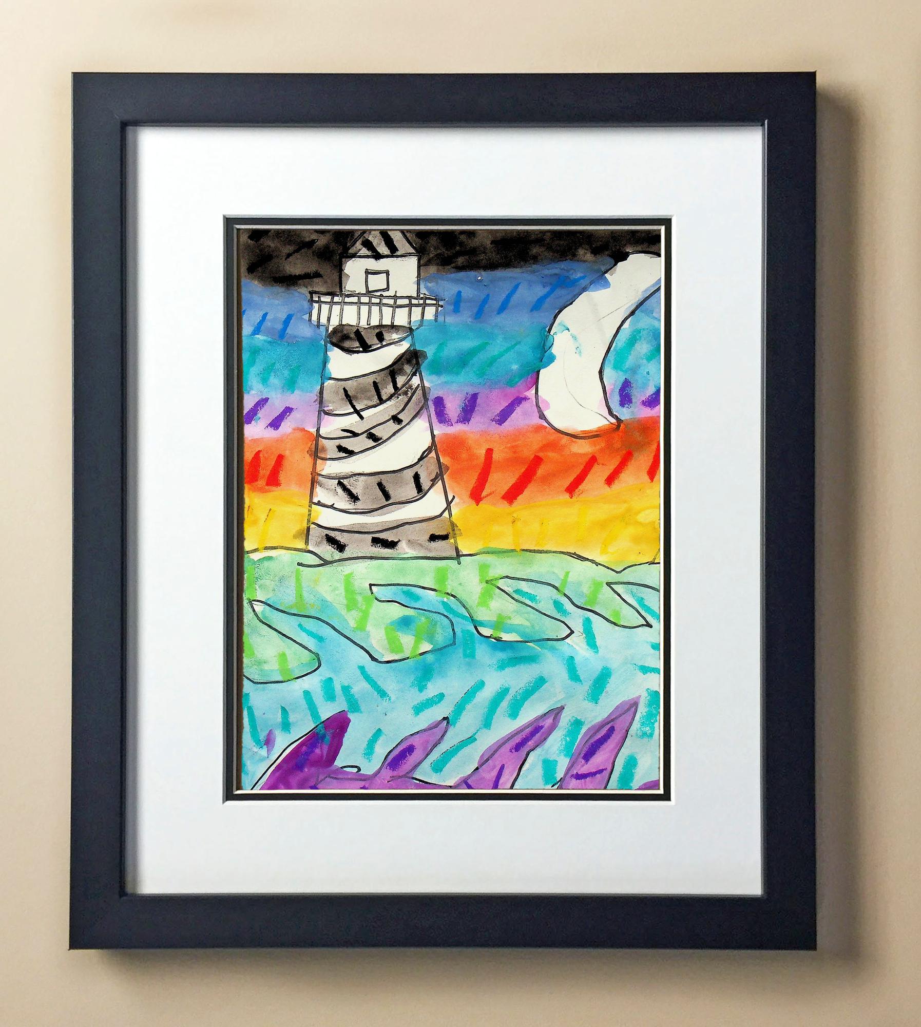 Included with the purchase is the Students Artwork, Frame, double matboard, shatter proof plexiglass, and a ready to hang backerboard with turnbuttons