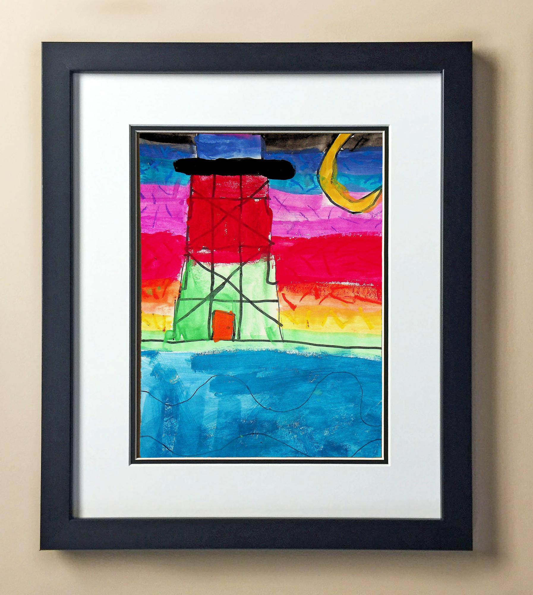 Included with the purchase is the Students Artwork, Frame, double matboard, shatter proof plexiglass, and a ready to hang backerboard with turnbuttons