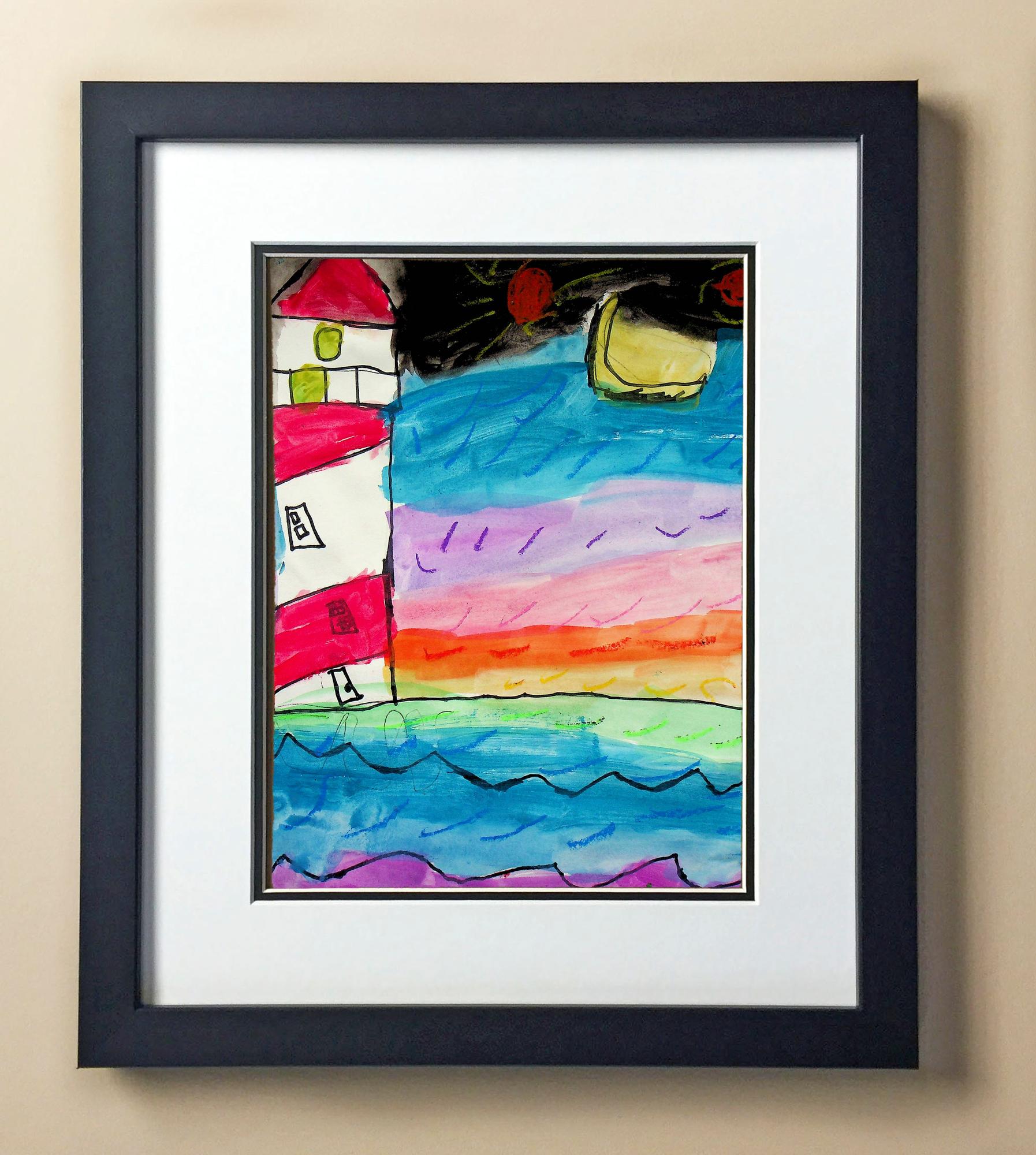 Included with the purchase is the Students Artwork, Frame, double matboard, shatter proof plexiglass, and a ready to hang backerboard with turnbuttons