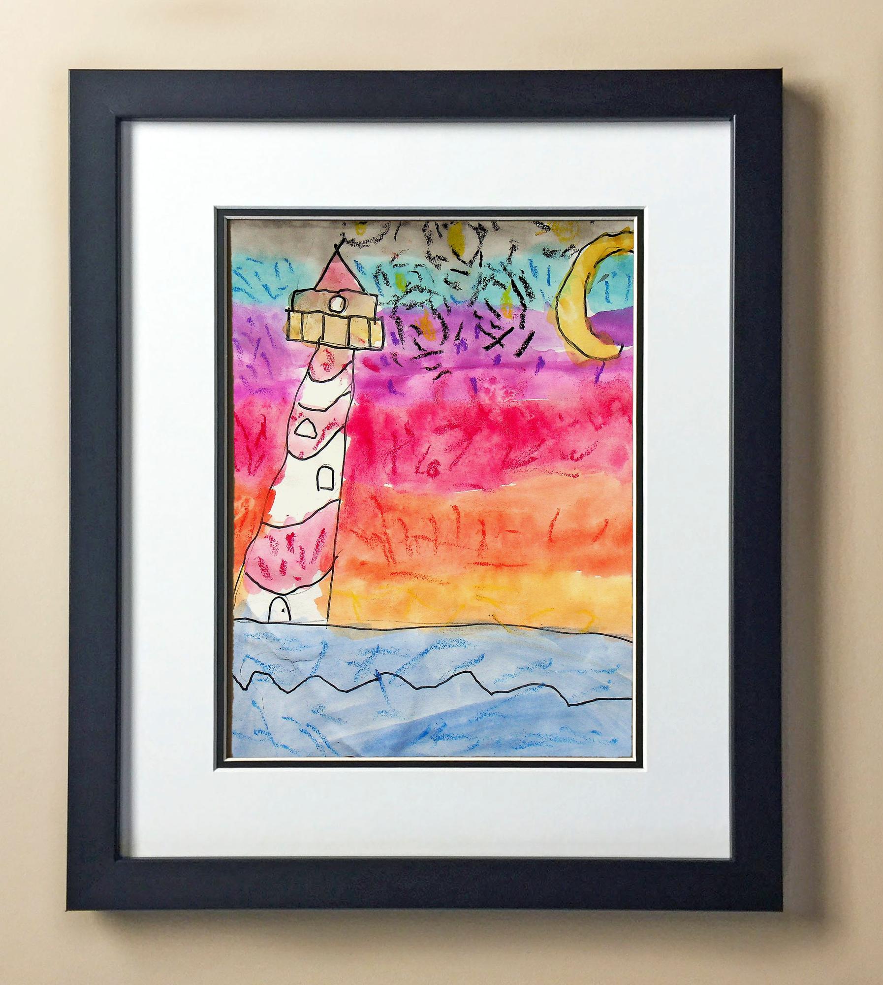 Included with the purchase is the Students Artwork, Frame, double matboard, shatter proof plexiglass, and a ready to hang backerboard with turnbuttons