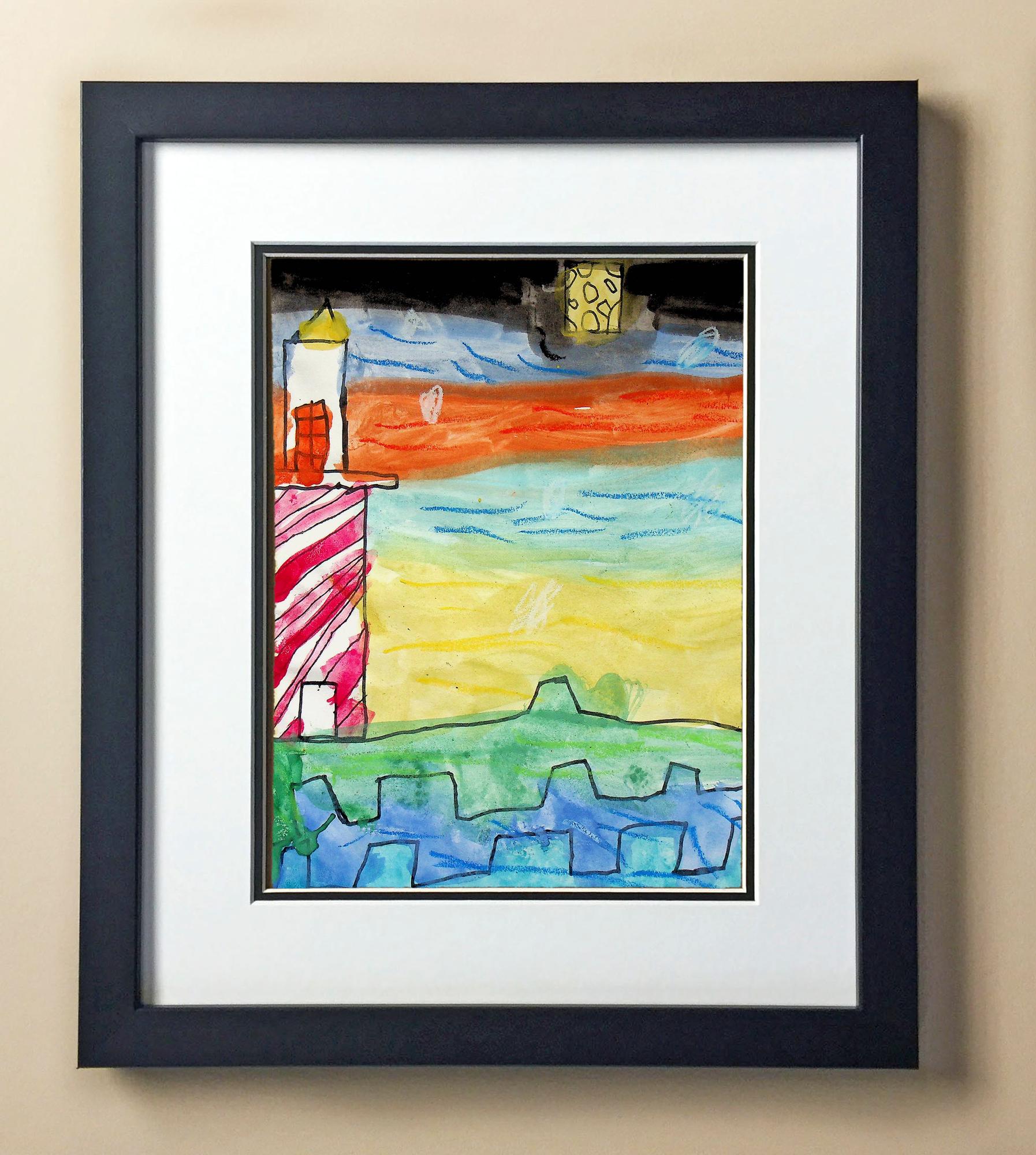Included with the purchase is the Students Artwork, Frame, double matboard, shatter proof plexiglass, and a ready to hang backerboard with turnbuttons