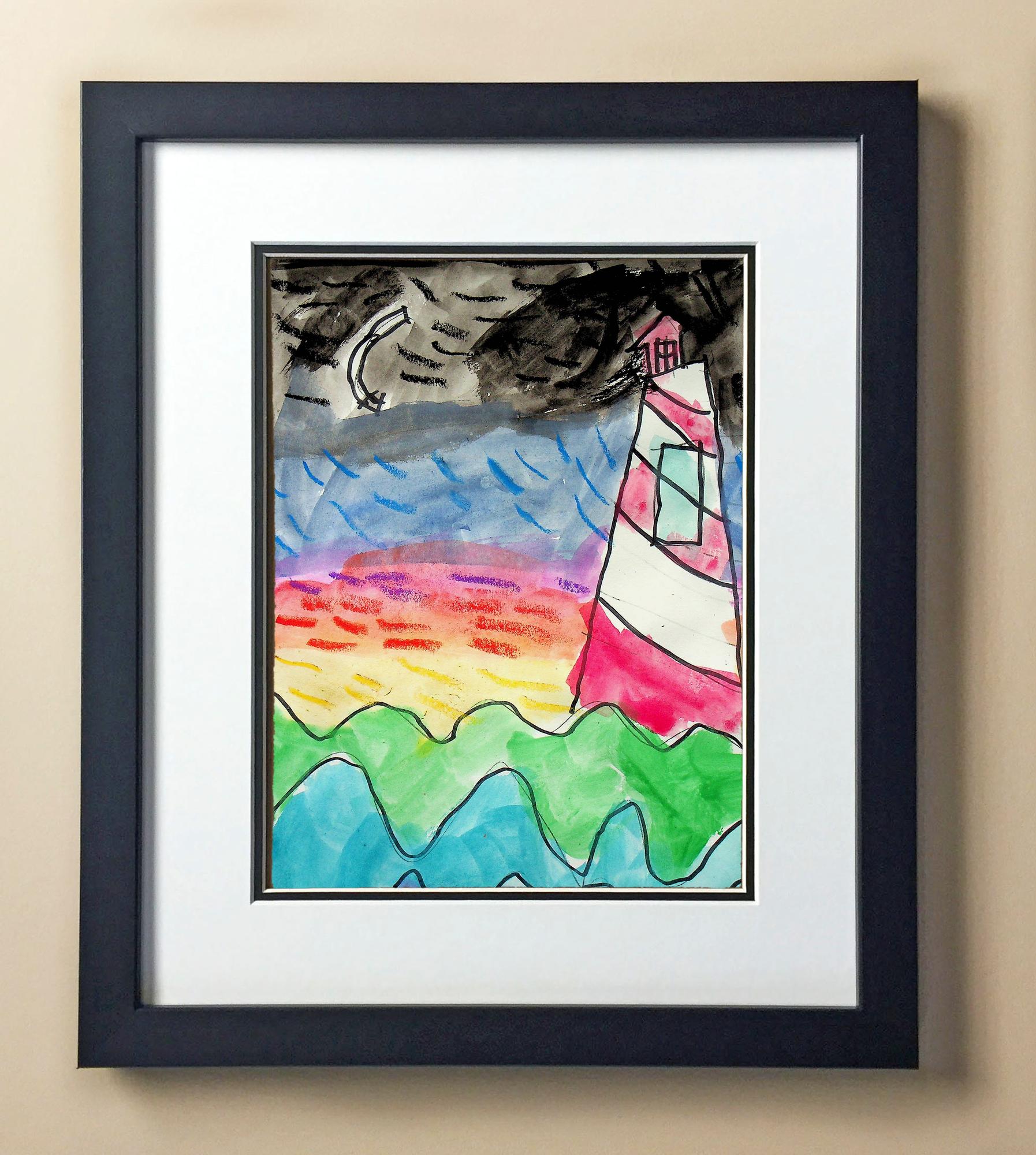 Included with the purchase is the Students Artwork, Frame, double matboard, shatter proof plexiglass, and a ready to hang backerboard with turnbuttons