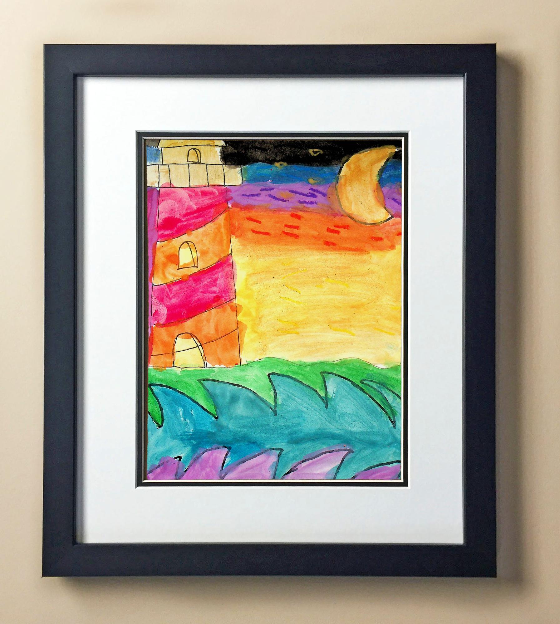 Included with the purchase is the Students Artwork, Frame, double matboard, shatter proof plexiglass, and a ready to hang backerboard with turnbuttons
