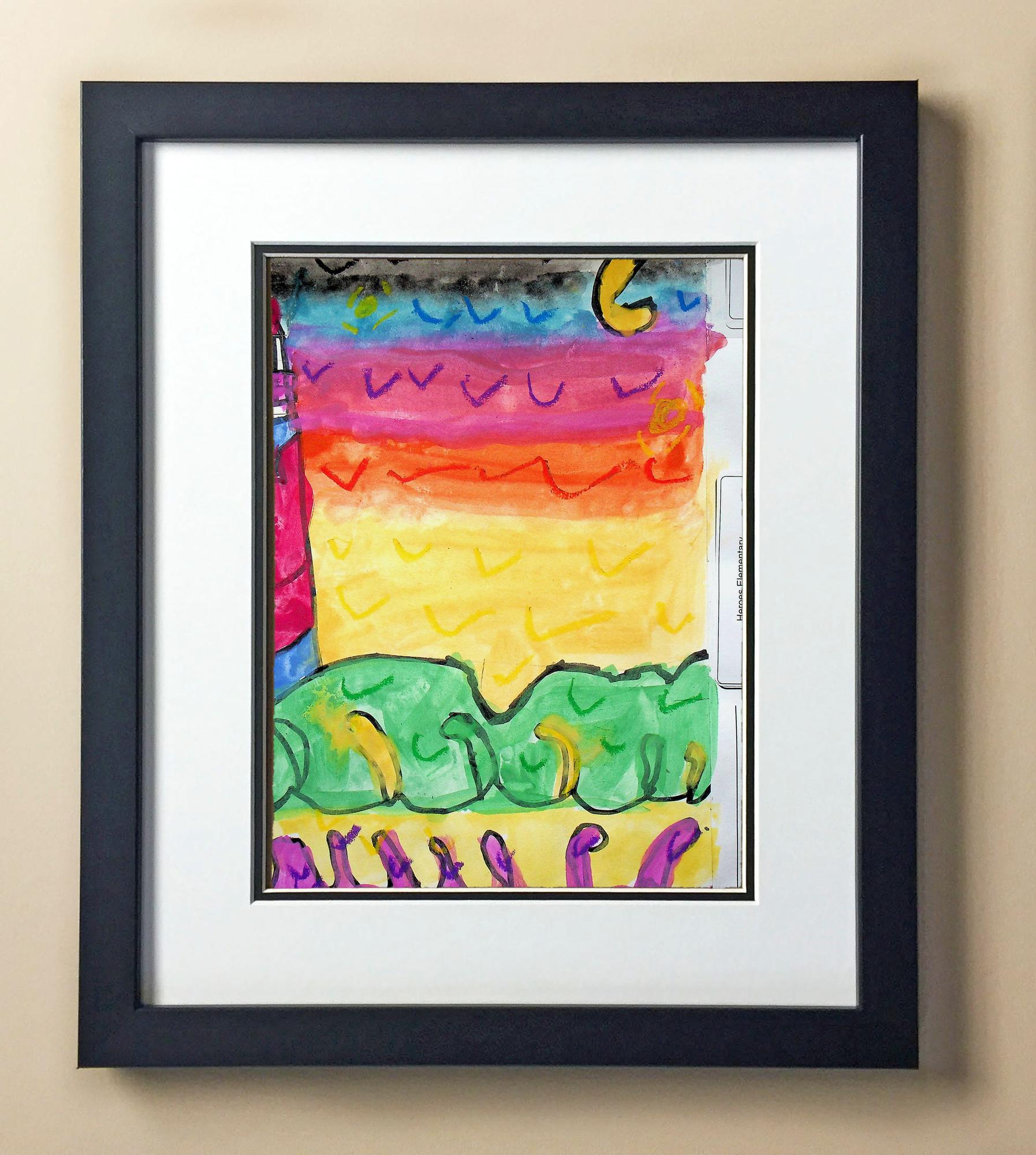 Included with the purchase is the Students Artwork, Frame, double matboard, shatter proof plexiglass, and a ready to hang backerboard with turnbuttons