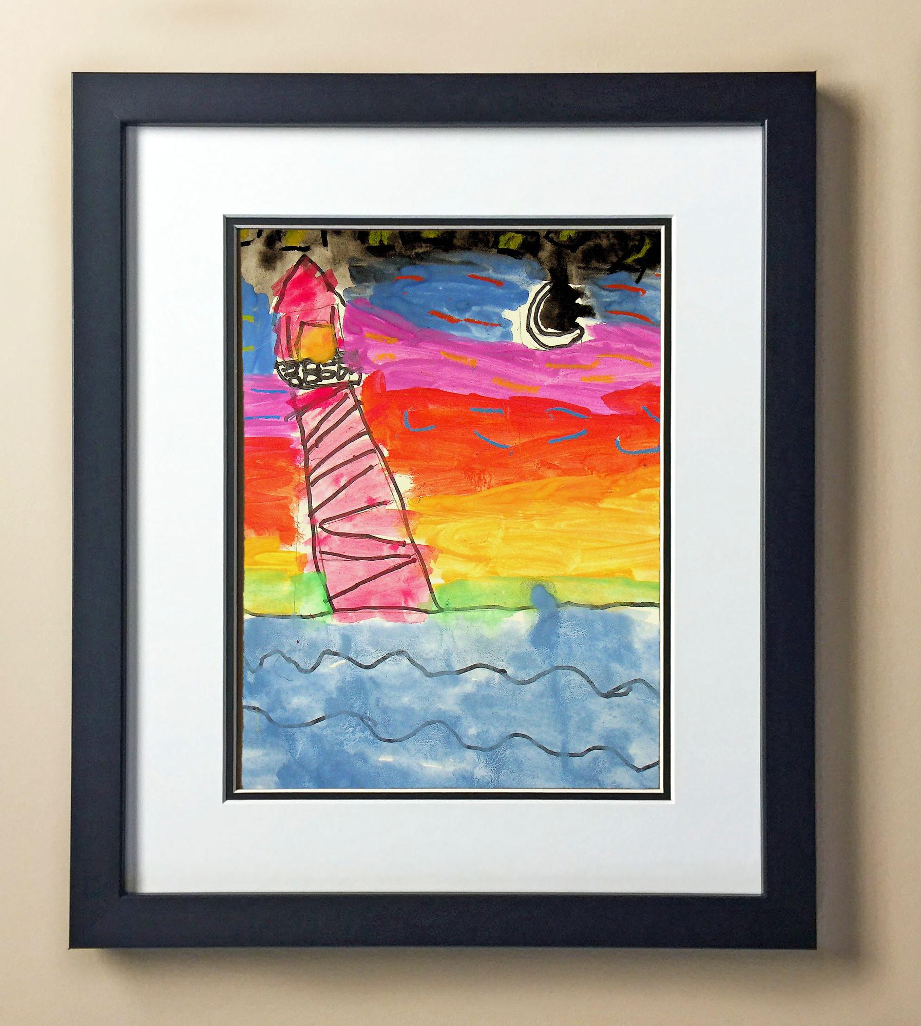 Included with the purchase is the Students Artwork, Frame, double matboard, shatter proof plexiglass, and a ready to hang backerboard with turnbuttons