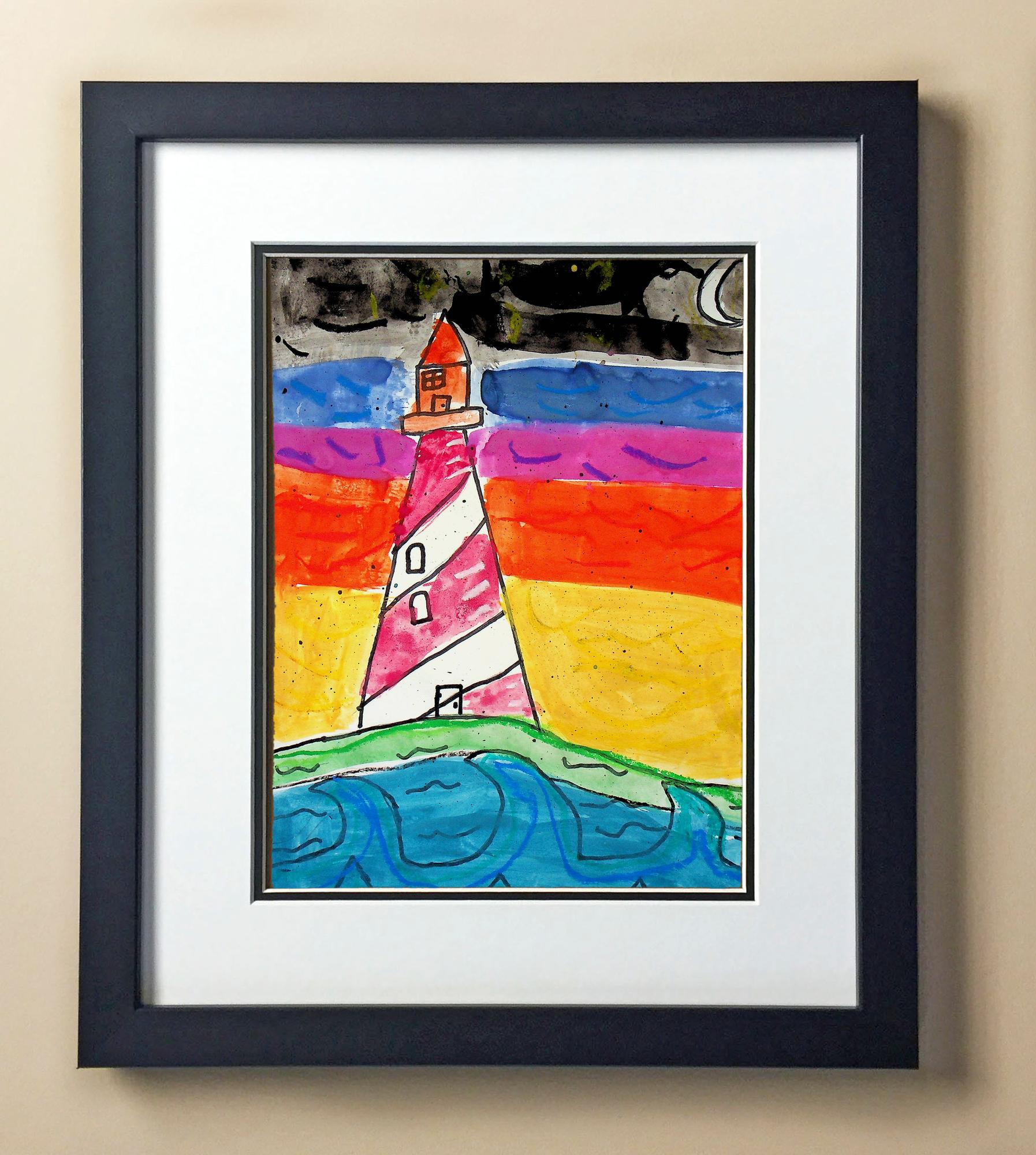 Included with the purchase is the Students Artwork, Frame, double matboard, shatter proof plexiglass, and a ready to hang backerboard with turnbuttons
