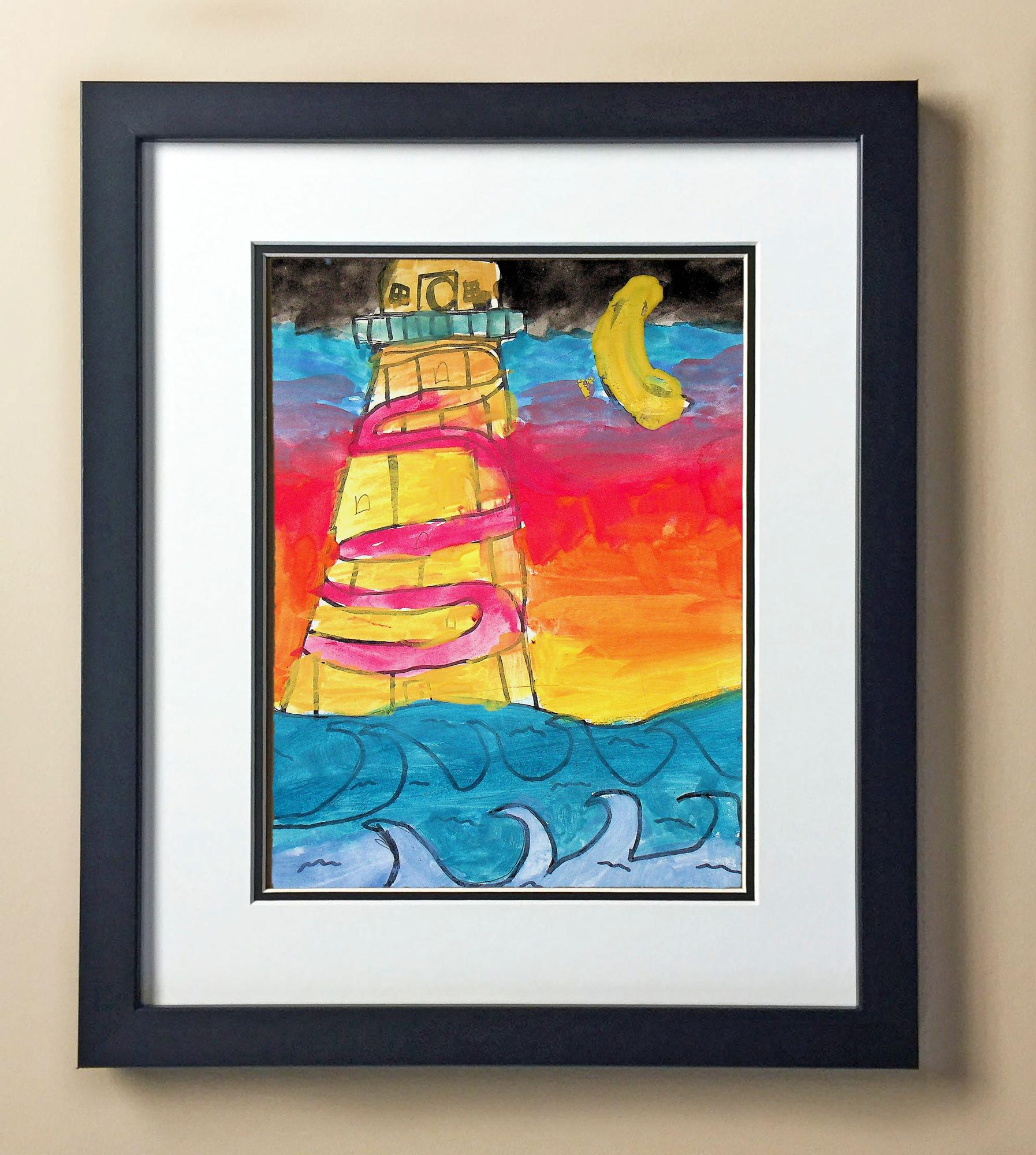 Included with the purchase is the Students Artwork, Frame, double matboard, shatter proof plexiglass, and a ready to hang backerboard with turnbuttons