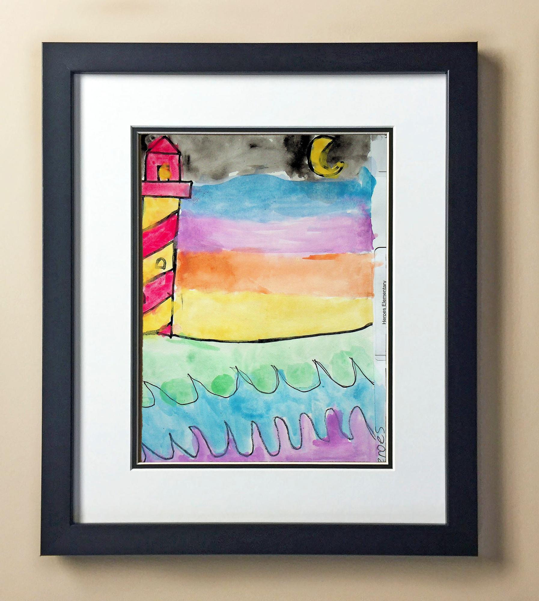 Included with the purchase is the Students Artwork, Frame, double matboard, shatter proof plexiglass, and a ready to hang backerboard with turnbuttons