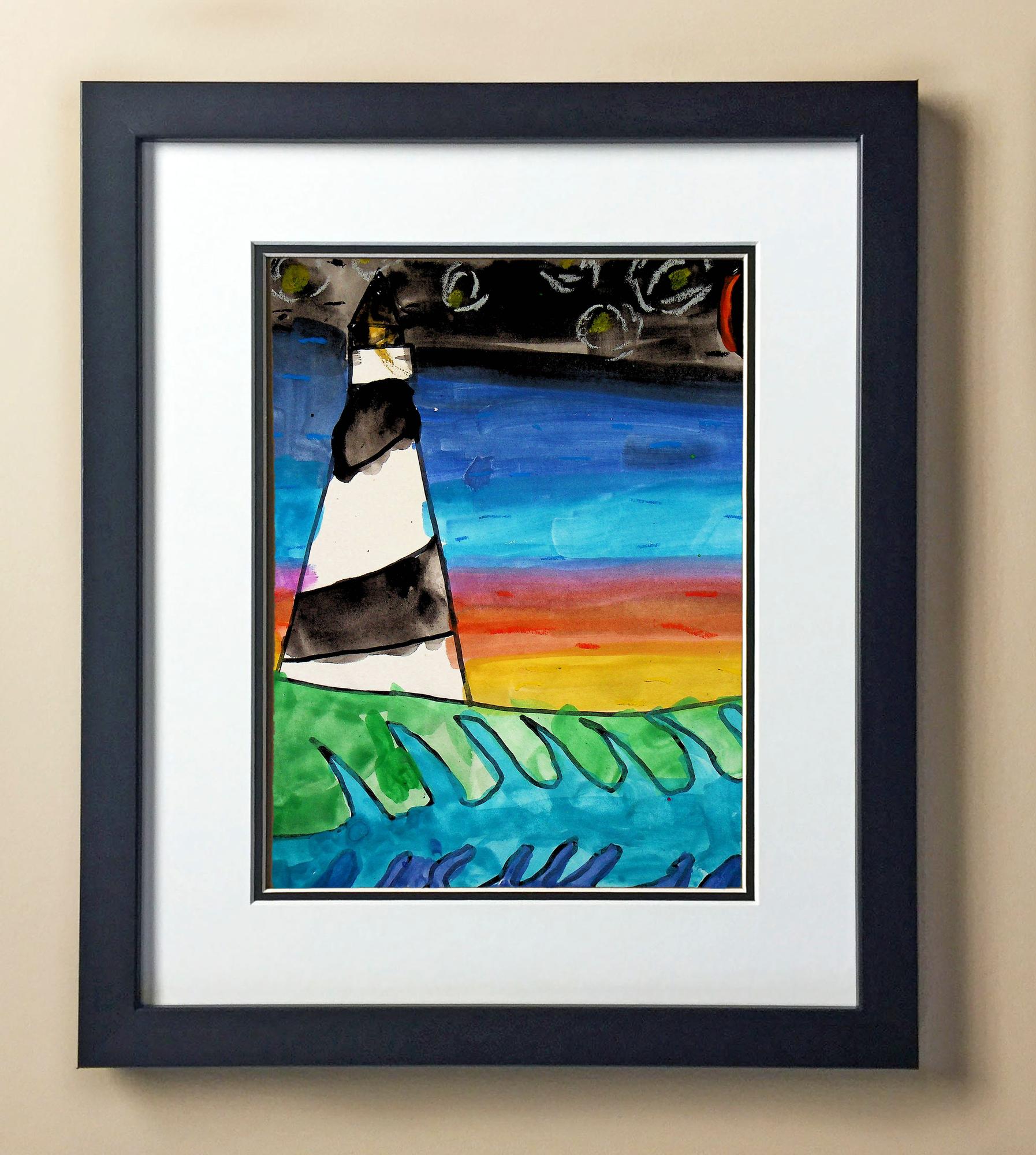 Included with the purchase is the Students Artwork, Frame, double matboard, shatter proof plexiglass, and a ready to hang backerboard with turnbuttons