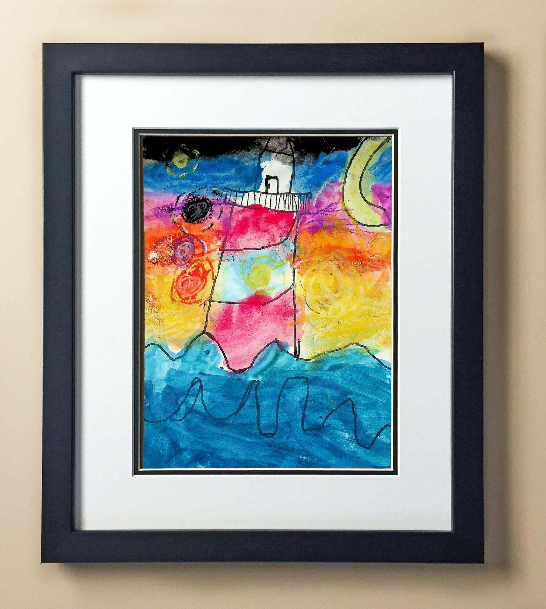 Included with the purchase is the Students Artwork, Frame, double matboard, shatter proof plexiglass, and a ready to hang backerboard with turnbuttons