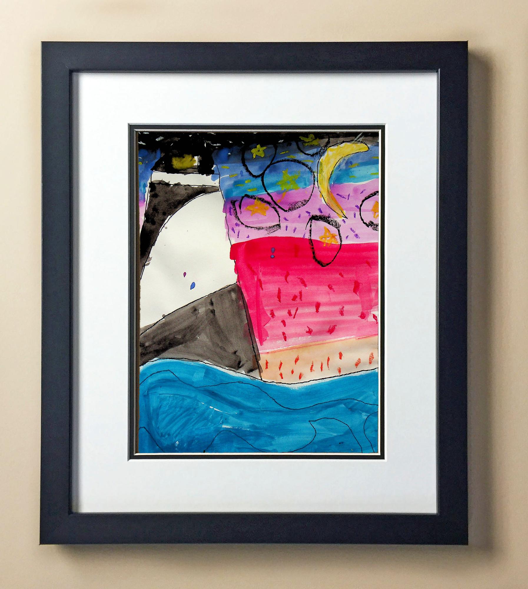 Included with the purchase is the Students Artwork, Frame, double matboard, shatter proof plexiglass, and a ready to hang backerboard with turnbuttons