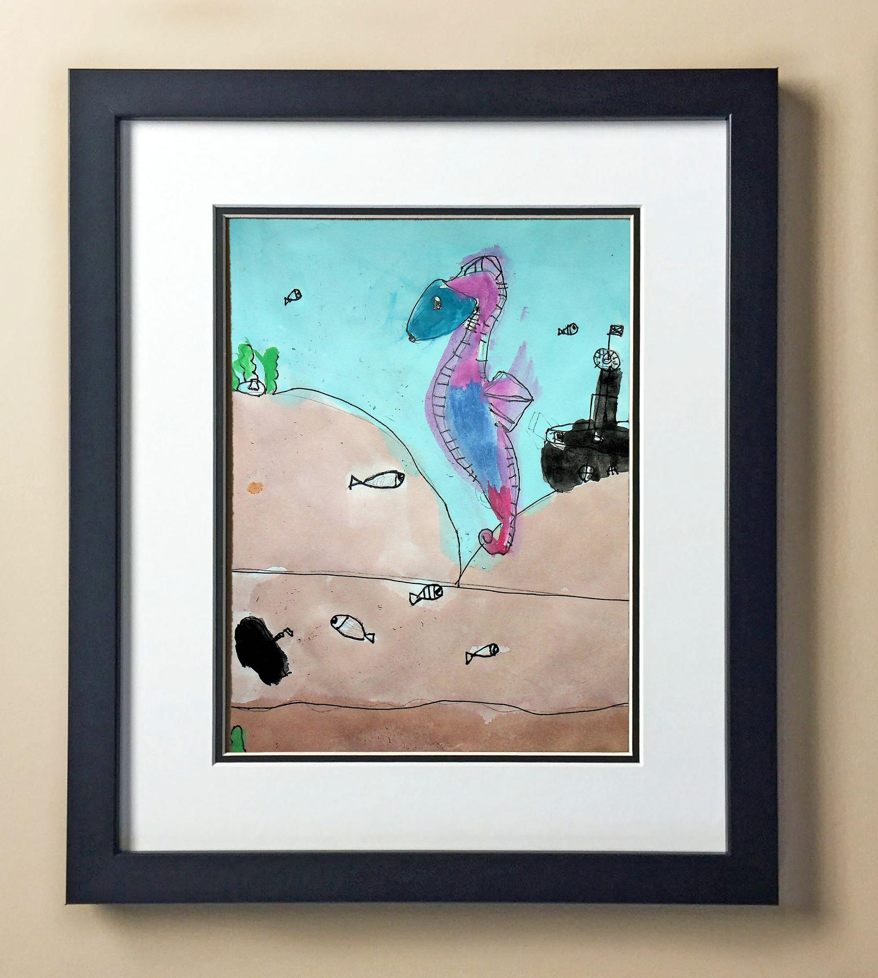 Included with the purchase is the Students Artwork, Frame, double matboard, shatter proof plexiglass, and a ready to hang backerboard with turnbuttons