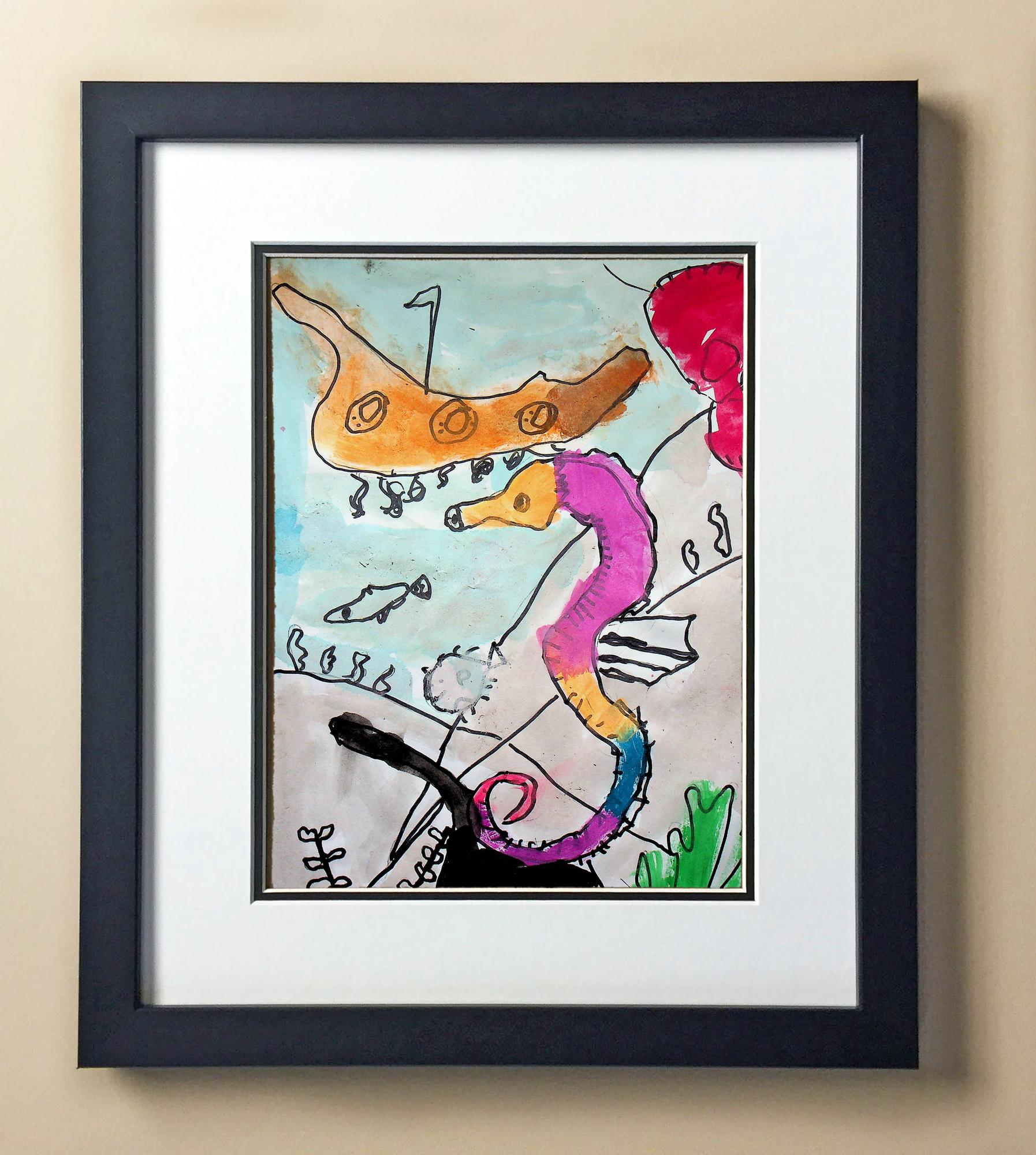 Included with the purchase is the Students Artwork, Frame, double matboard, shatter proof plexiglass, and a ready to hang backerboard with turnbuttons