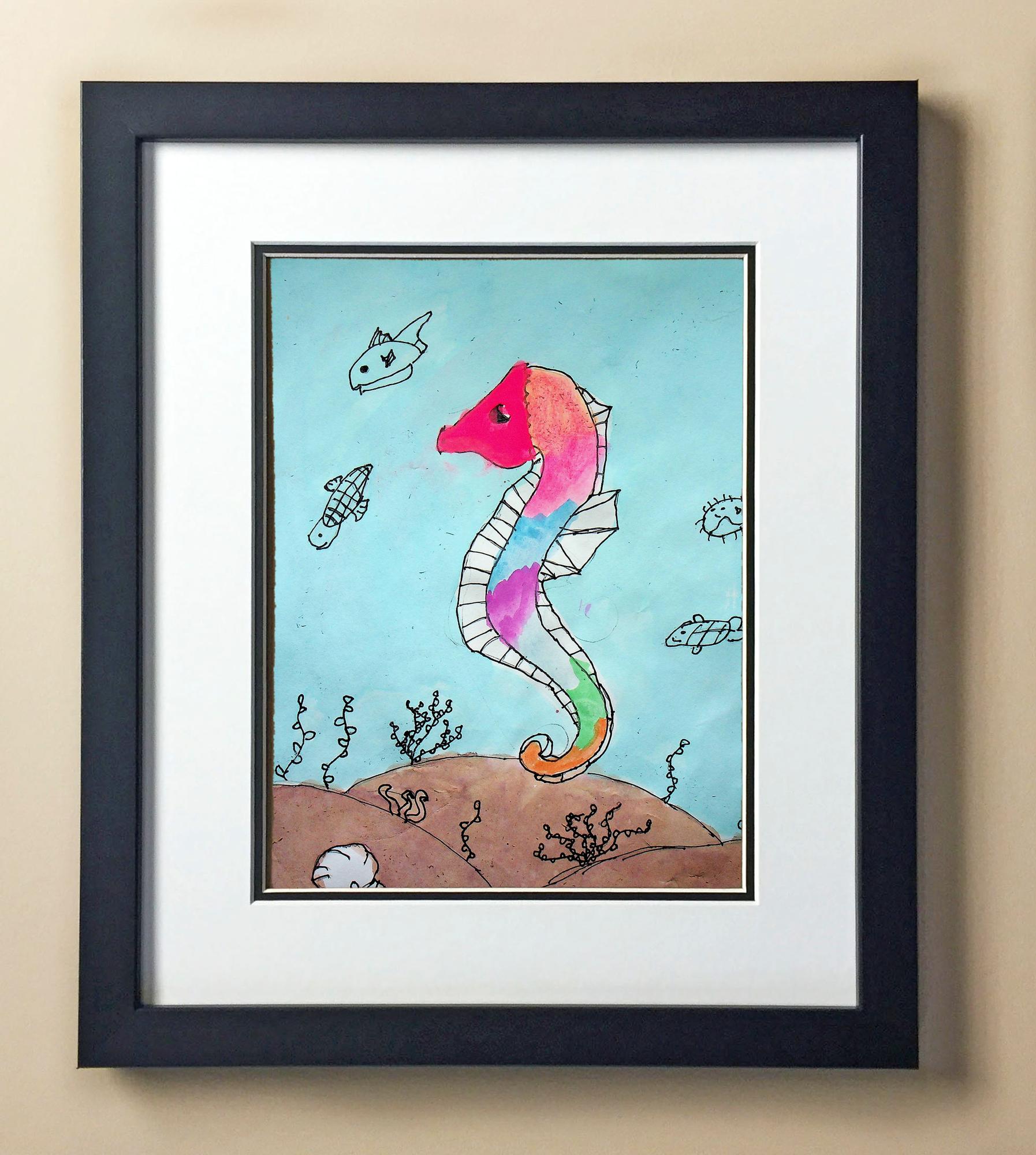 Included with the purchase is the Students Artwork, Frame, double matboard, shatter proof plexiglass, and a ready to hang backerboard with turnbuttons