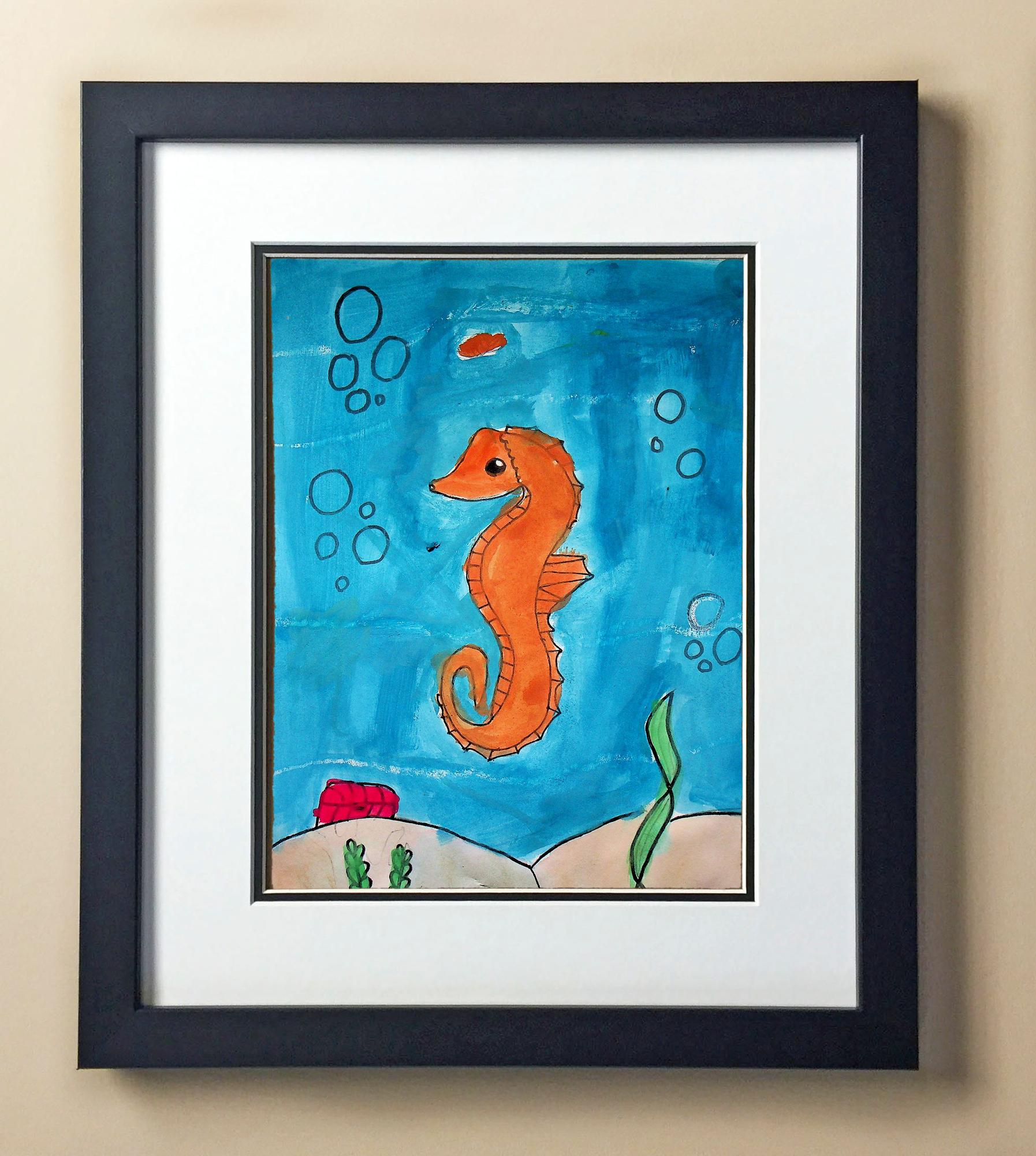 Included with the purchase is the Students Artwork, Frame, double matboard, shatter proof plexiglass, and a ready to hang backerboard with turnbuttons