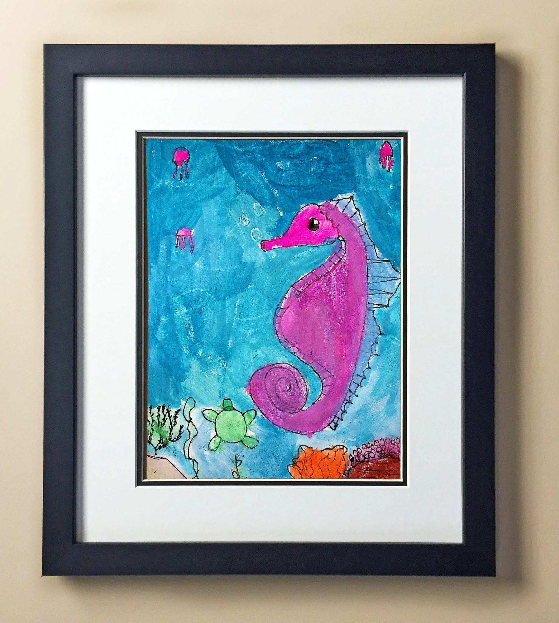 Included with the purchase is the Students Artwork, Frame, double matboard, shatter proof plexiglass, and a ready to hang backerboard with turnbuttons