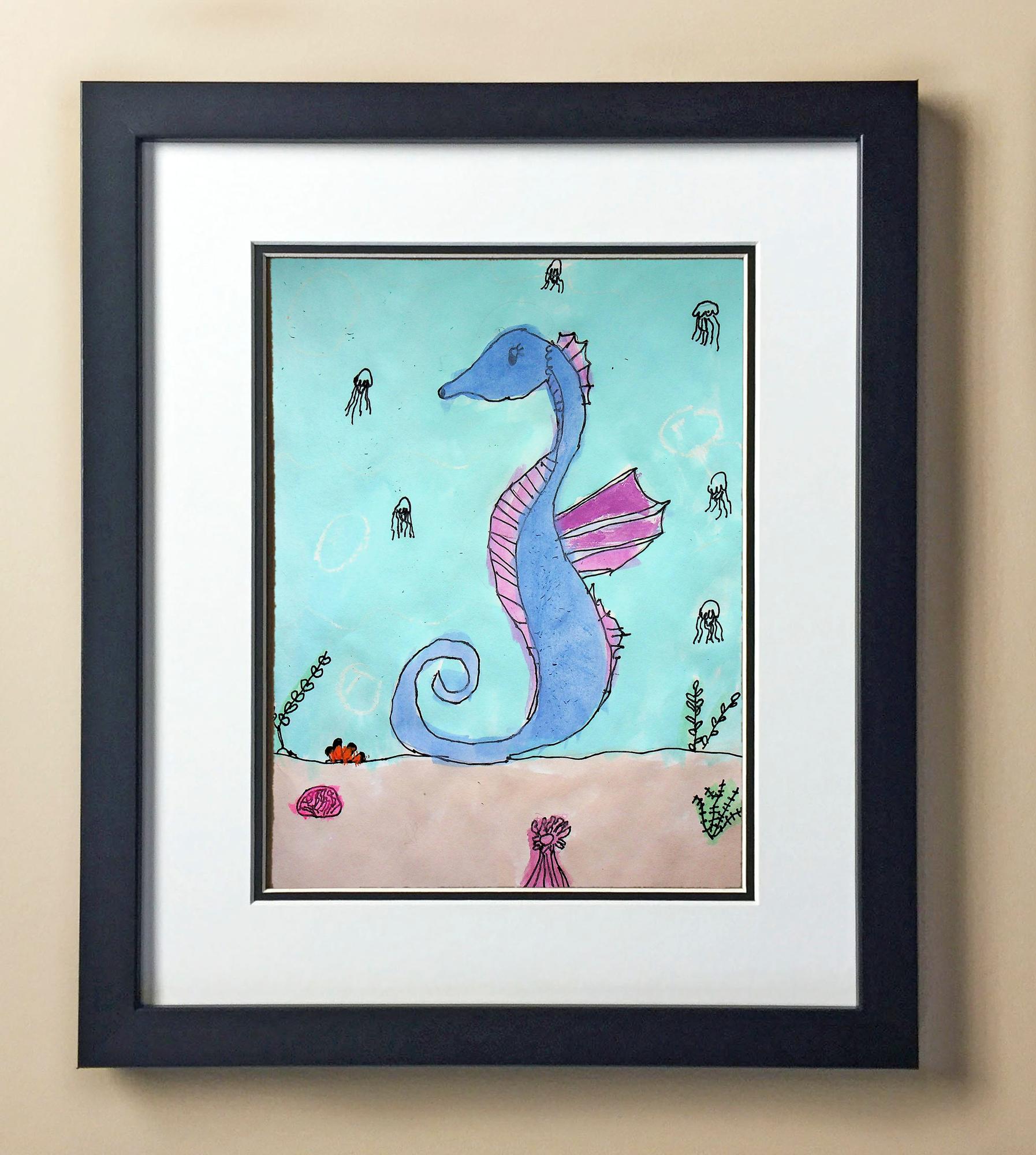 Included with the purchase is the Students Artwork, Frame, double matboard, shatter proof plexiglass, and a ready to hang backerboard with turnbuttons