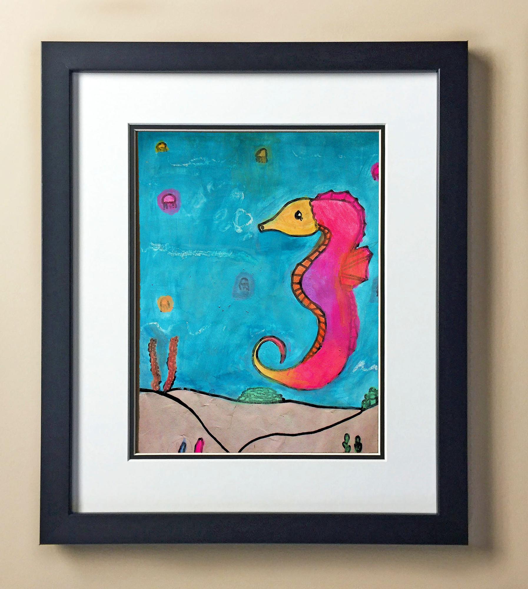 Included with the purchase is the Students Artwork, Frame, double matboard, shatter proof plexiglass, and a ready to hang backerboard with turnbuttons