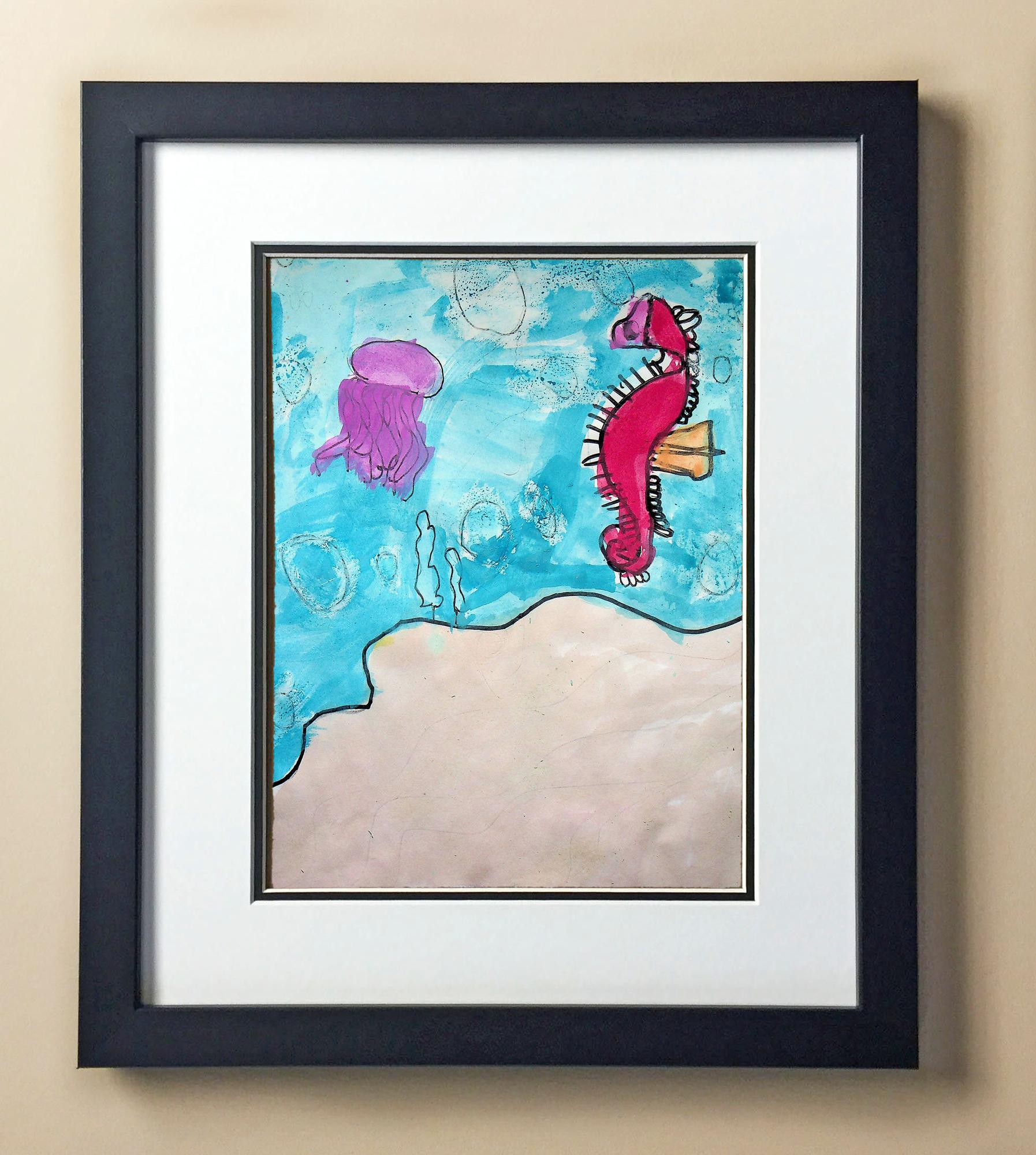 Included with the purchase is the Students Artwork, Frame, double matboard, shatter proof plexiglass, and a ready to hang backerboard with turnbuttons