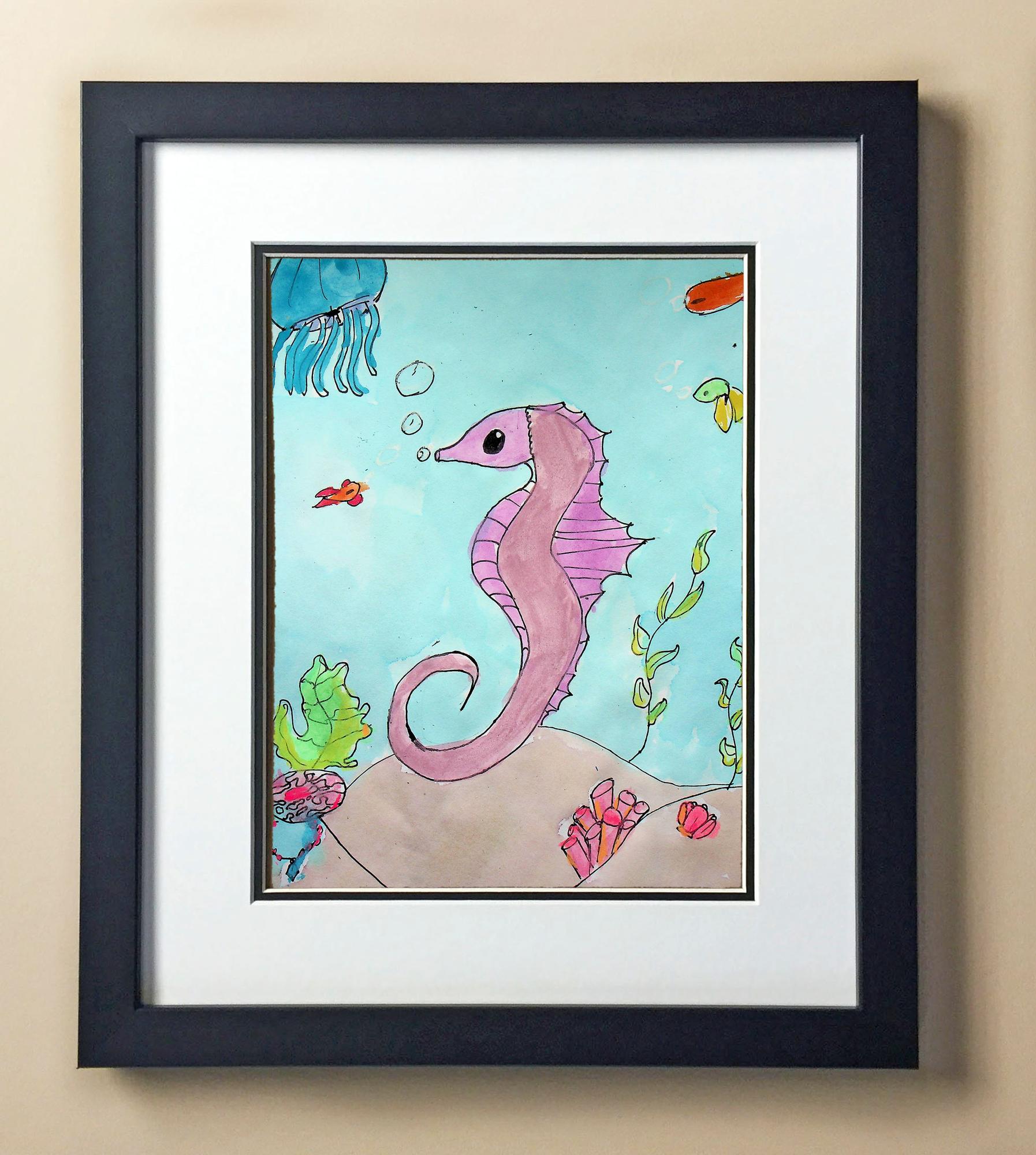 Included with the purchase is the Students Artwork, Frame, double matboard, shatter proof plexiglass, and a ready to hang backerboard with turnbuttons