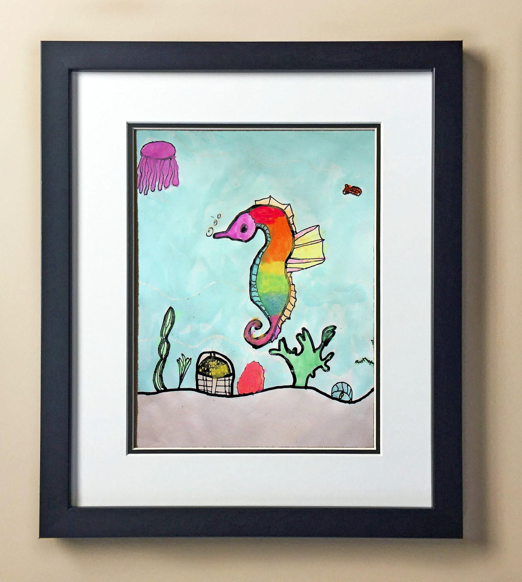 Included with the purchase is the Students Artwork, Frame, double matboard, shatter proof plexiglass, and a ready to hang backerboard with turnbuttons