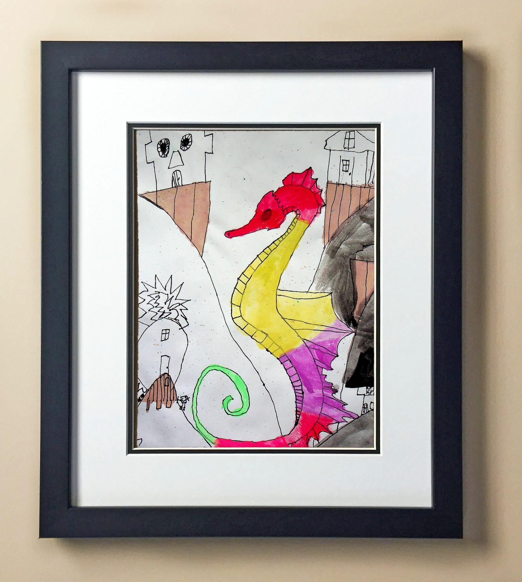 Included with the purchase is the Students Artwork, Frame, double matboard, shatter proof plexiglass, and a ready to hang backerboard with turnbuttons
