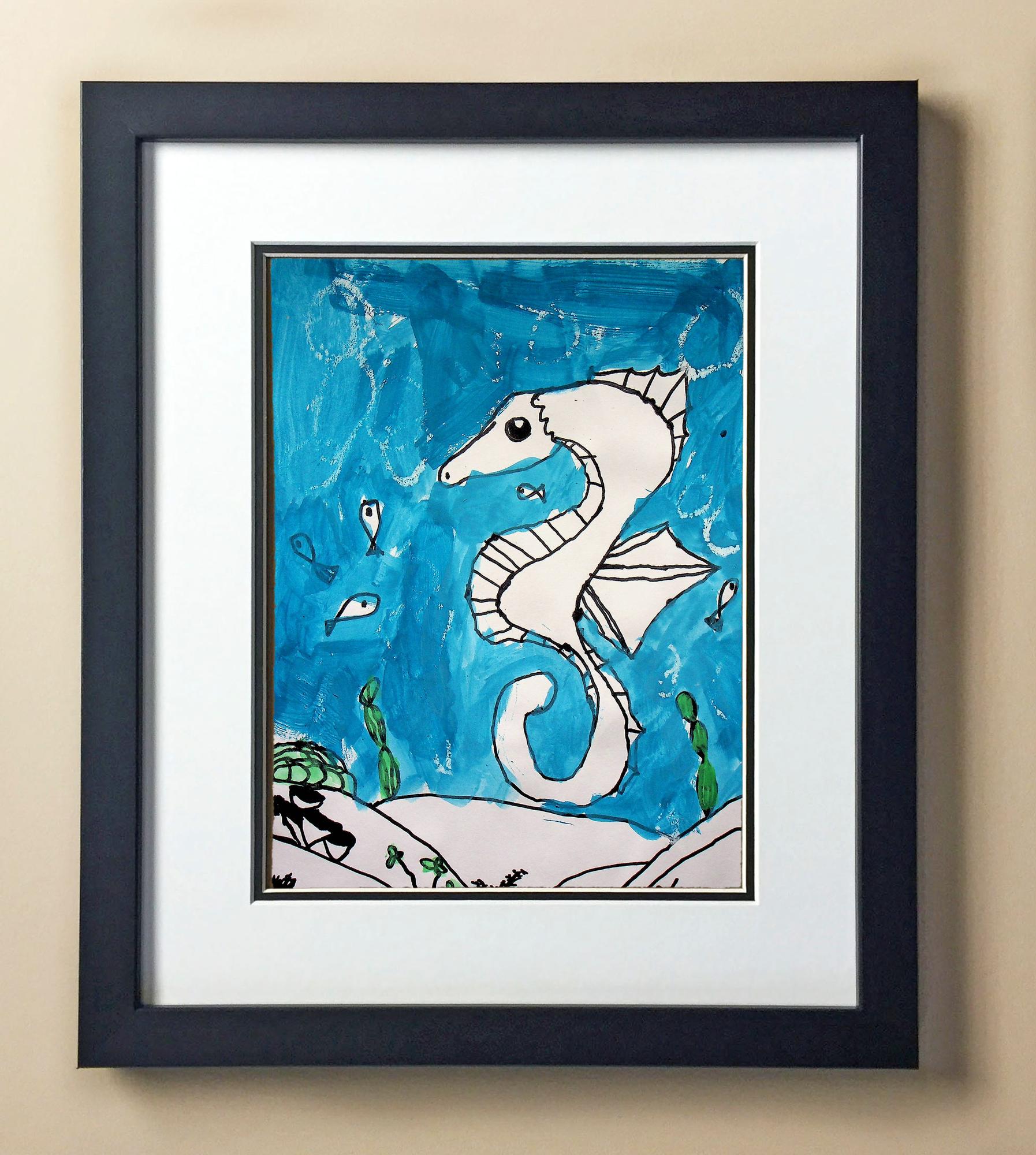 Included with the purchase is the Students Artwork, Frame, double matboard, shatter proof plexiglass, and a ready to hang backerboard with turnbuttons