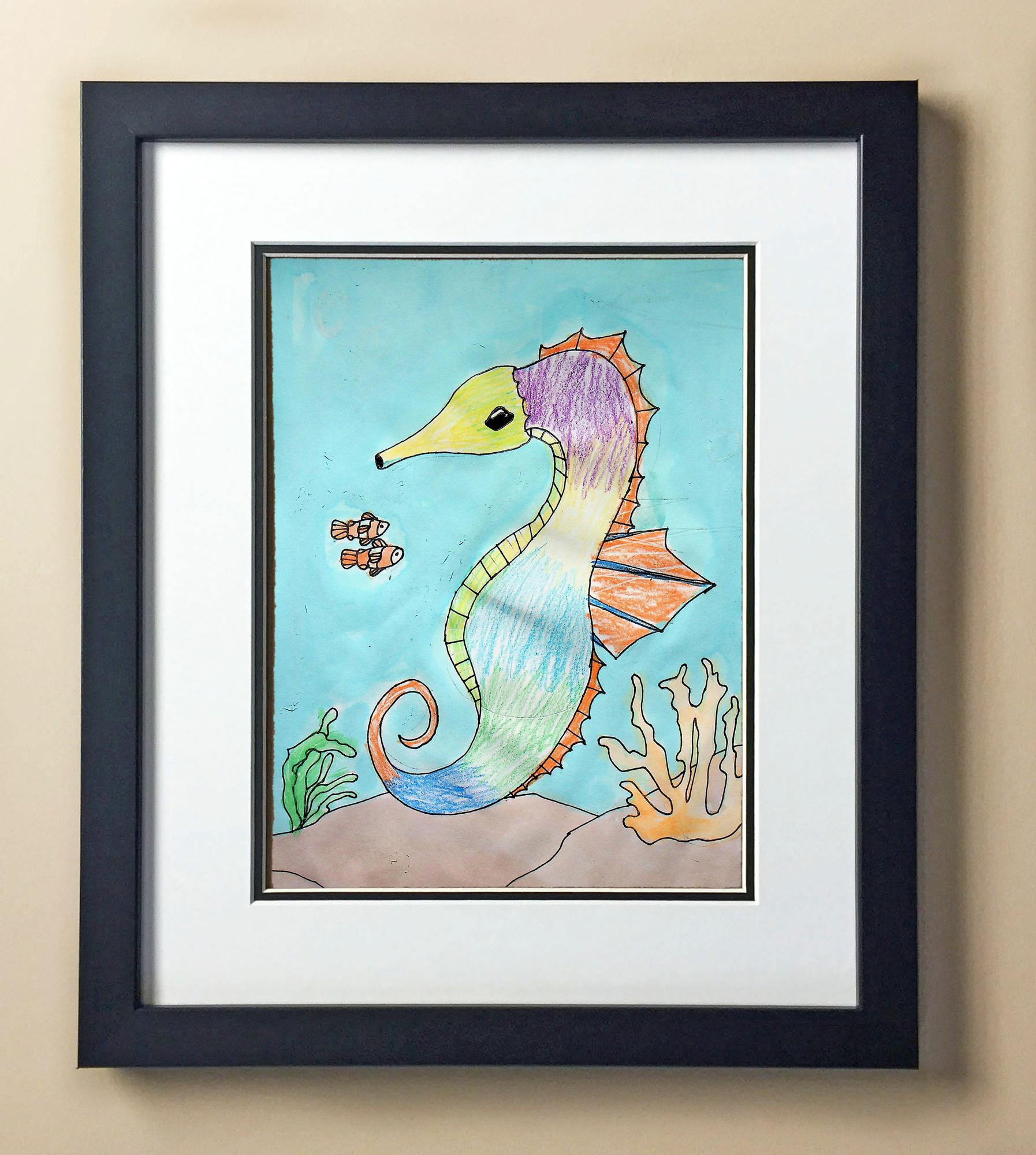 Included with the purchase is the Students Artwork, Frame, double matboard, shatter proof plexiglass, and a ready to hang backerboard with turnbuttons