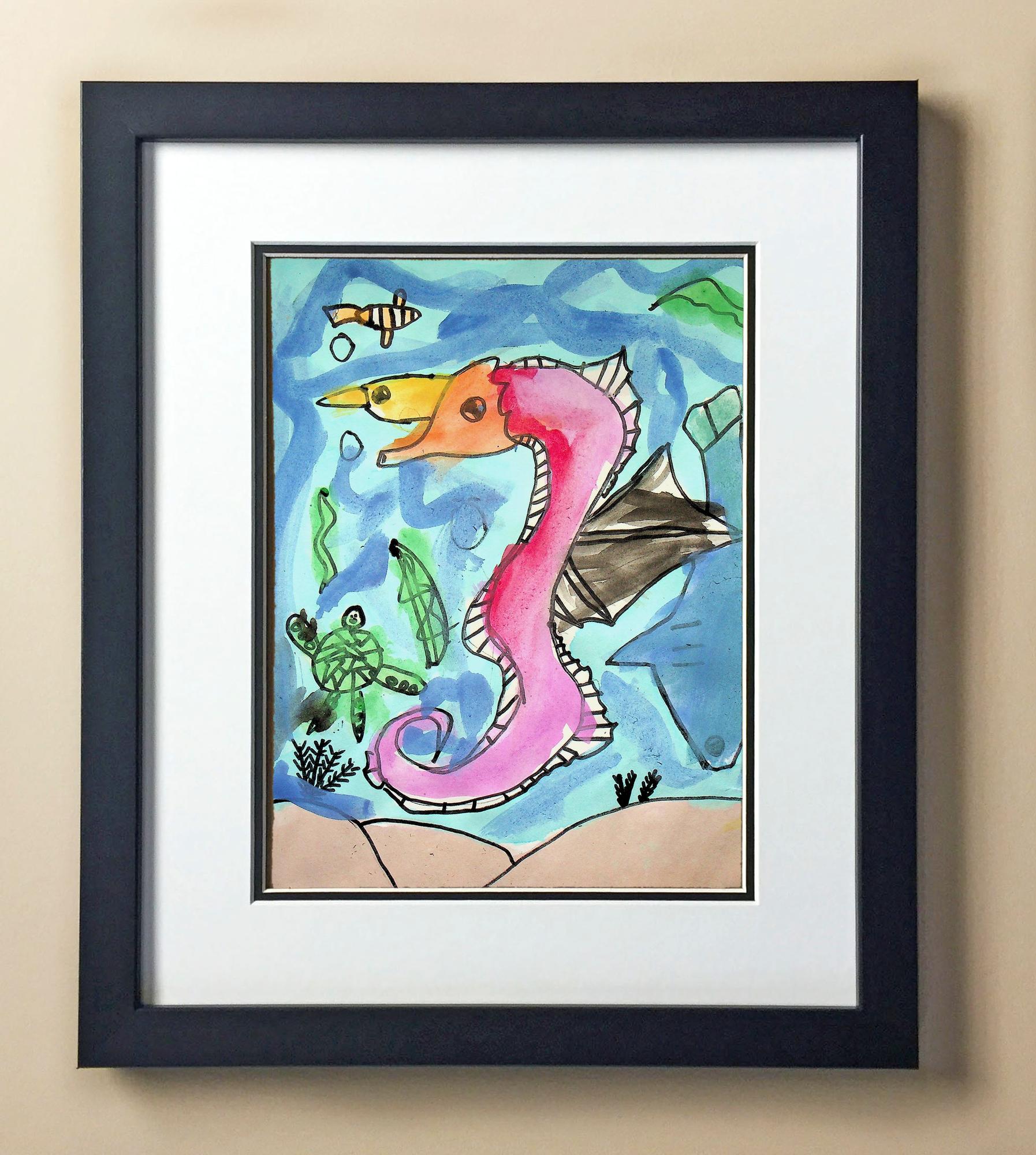 Included with the purchase is the Students Artwork, Frame, double matboard, shatter proof plexiglass, and a ready to hang backerboard with turnbuttons