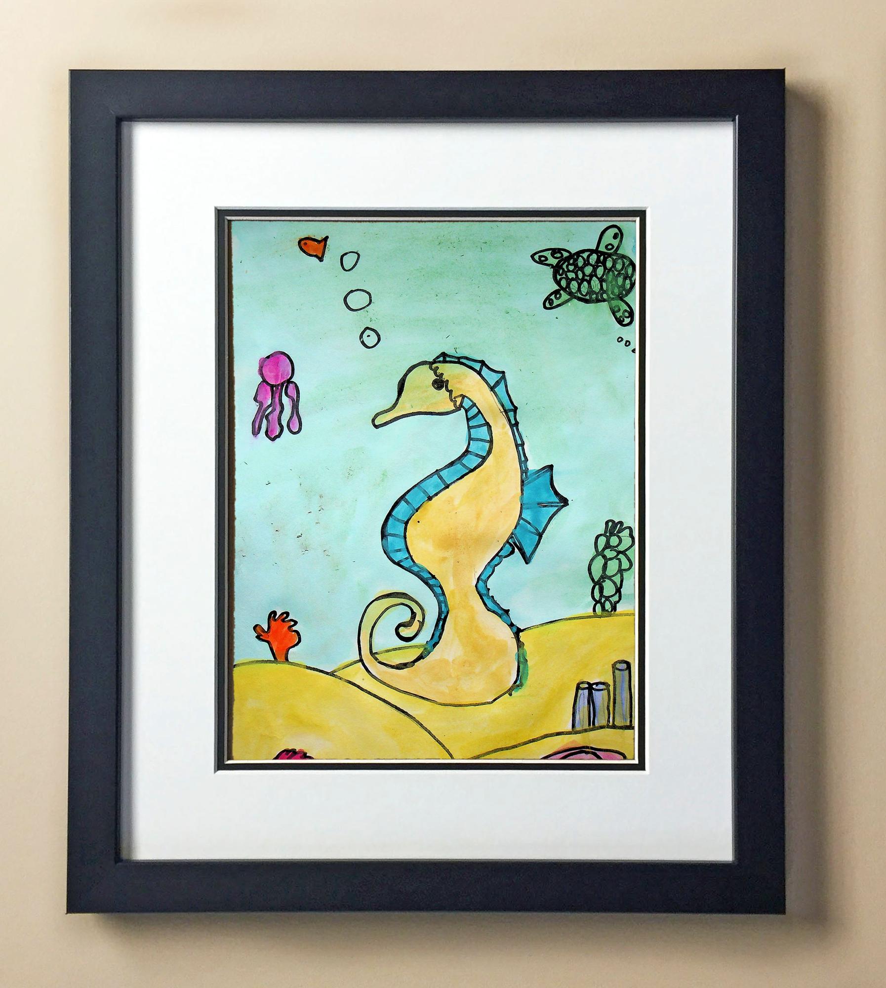 Included with the purchase is the Students Artwork, Frame, double matboard, shatter proof plexiglass, and a ready to hang backerboard with turnbuttons