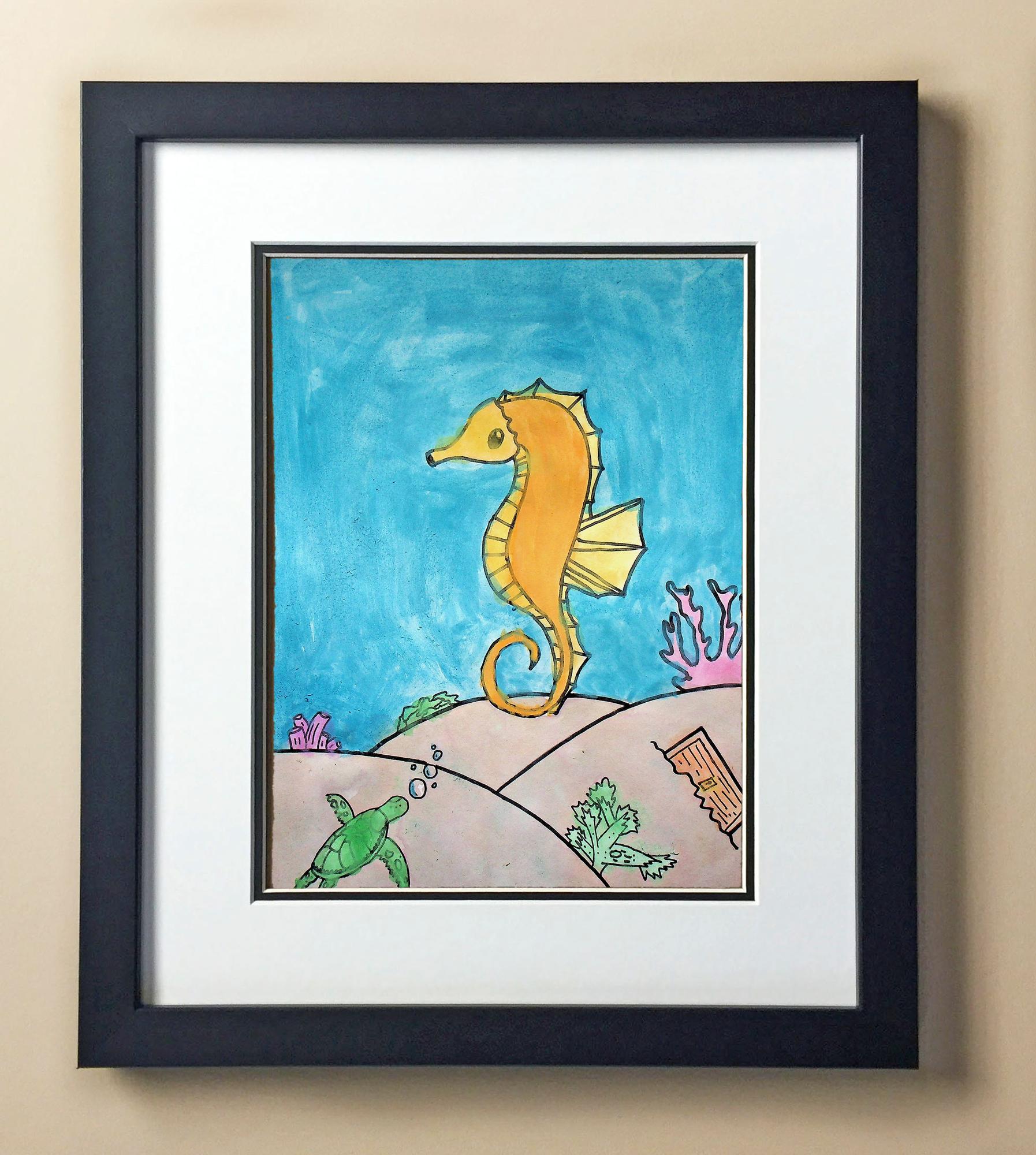 Included with the purchase is the Students Artwork, Frame, double matboard, shatter proof plexiglass, and a ready to hang backerboard with turnbuttons