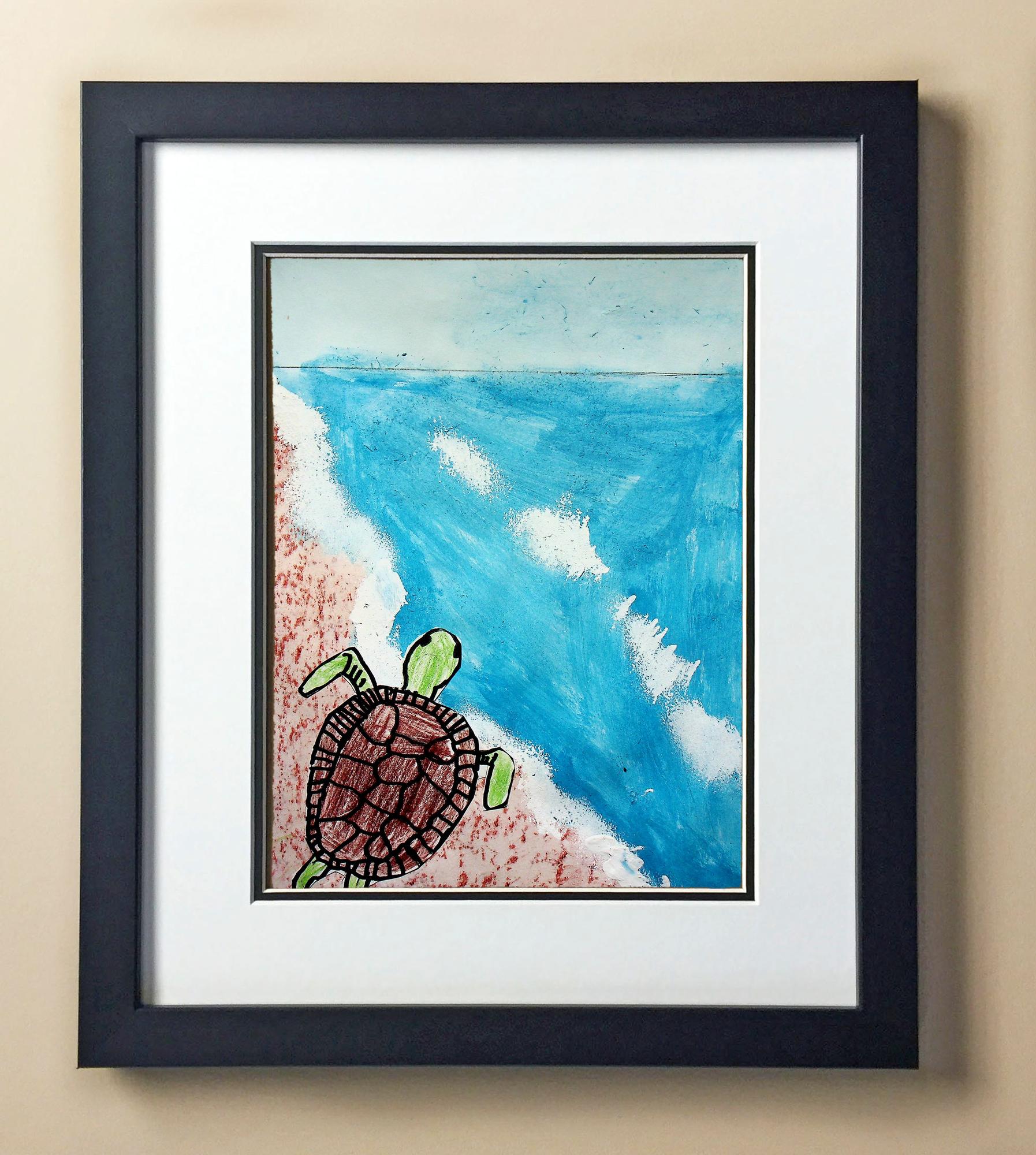 Included with the purchase is the Students Artwork, Frame, double matboard, shatter proof plexiglass, and a ready to hang backerboard with turnbuttons