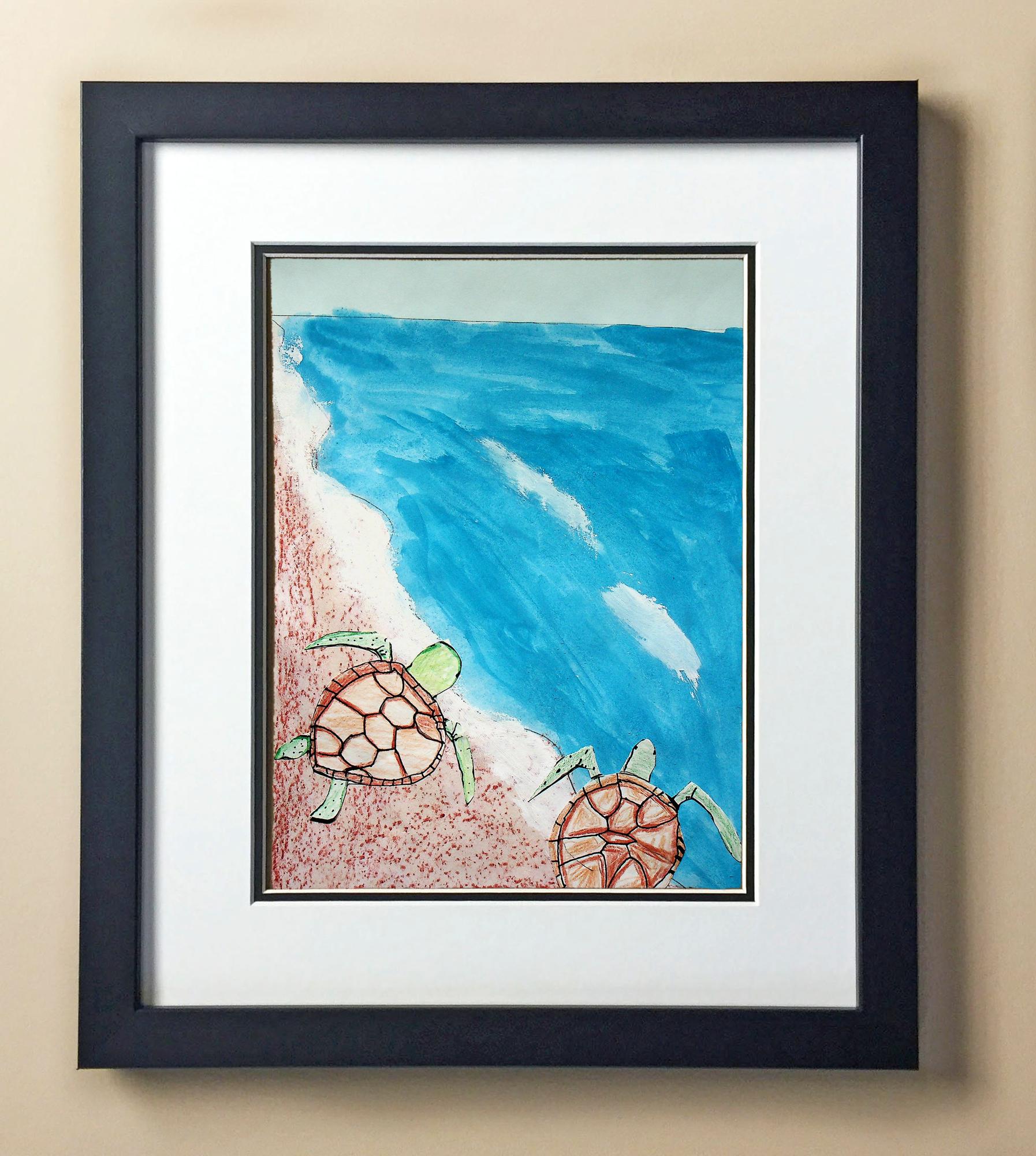 Included with the purchase is the Students Artwork, Frame, double matboard, shatter proof plexiglass, and a ready to hang backerboard with turnbuttons