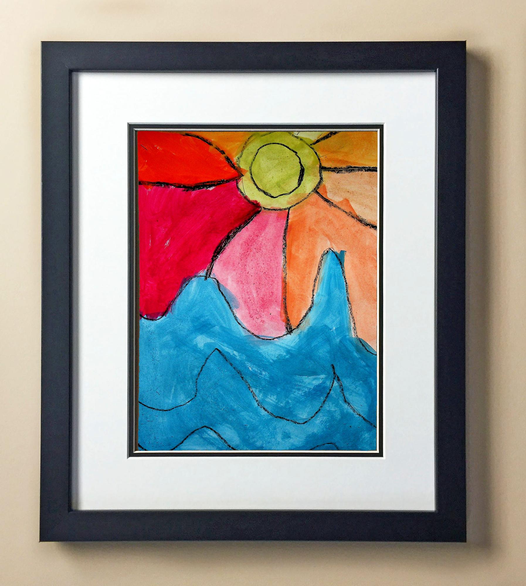 Included with the purchase is the Students Artwork, Frame, double matboard, shatter proof plexiglass, and a ready to hang backerboard with turnbuttons