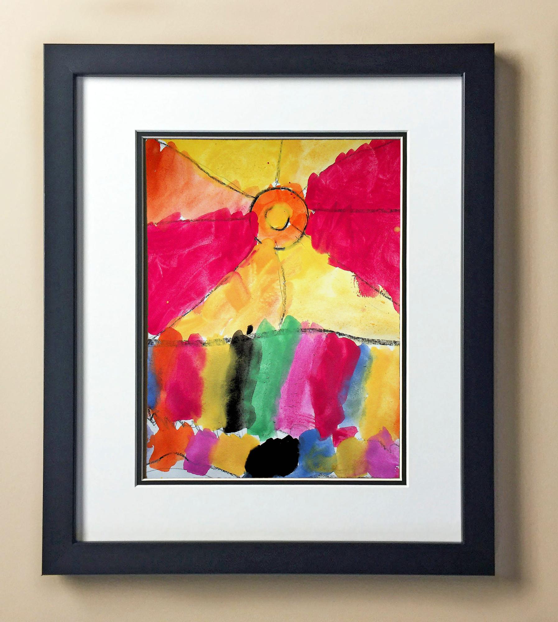 Included with the purchase is the Students Artwork, Frame, double matboard, shatter proof plexiglass, and a ready to hang backerboard with turnbuttons