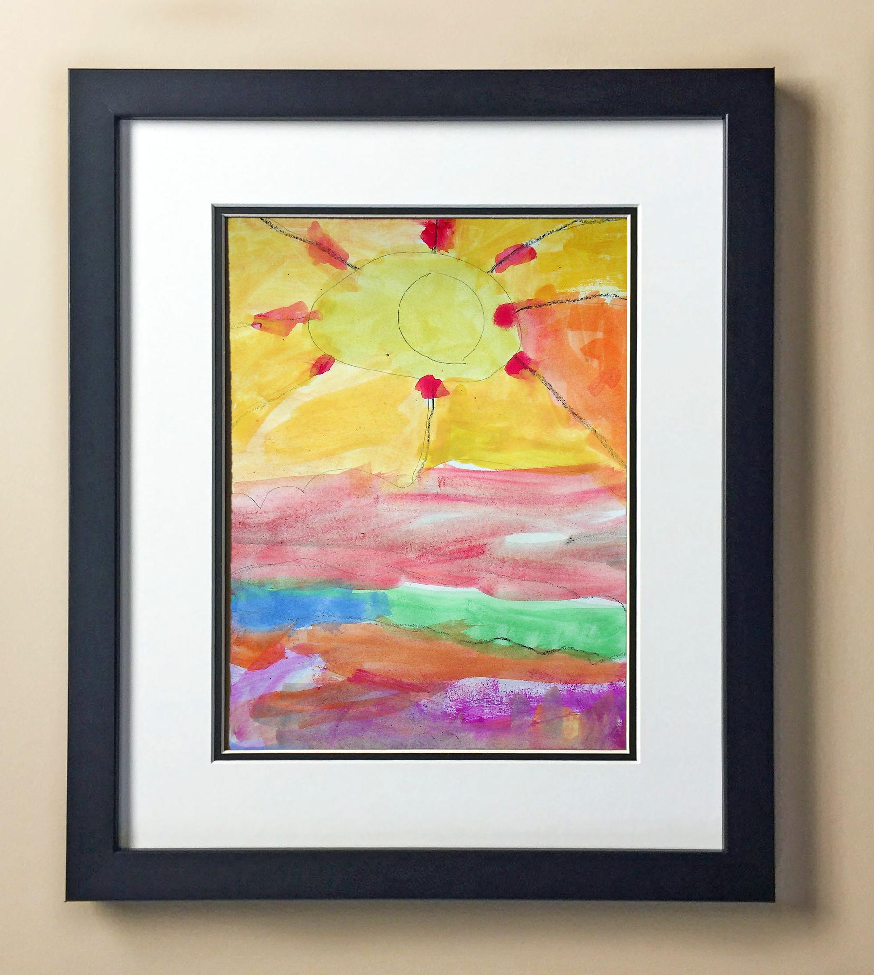 Included with the purchase is the Students Artwork, Frame, double matboard, shatter proof plexiglass, and a ready to hang backerboard with turnbuttons