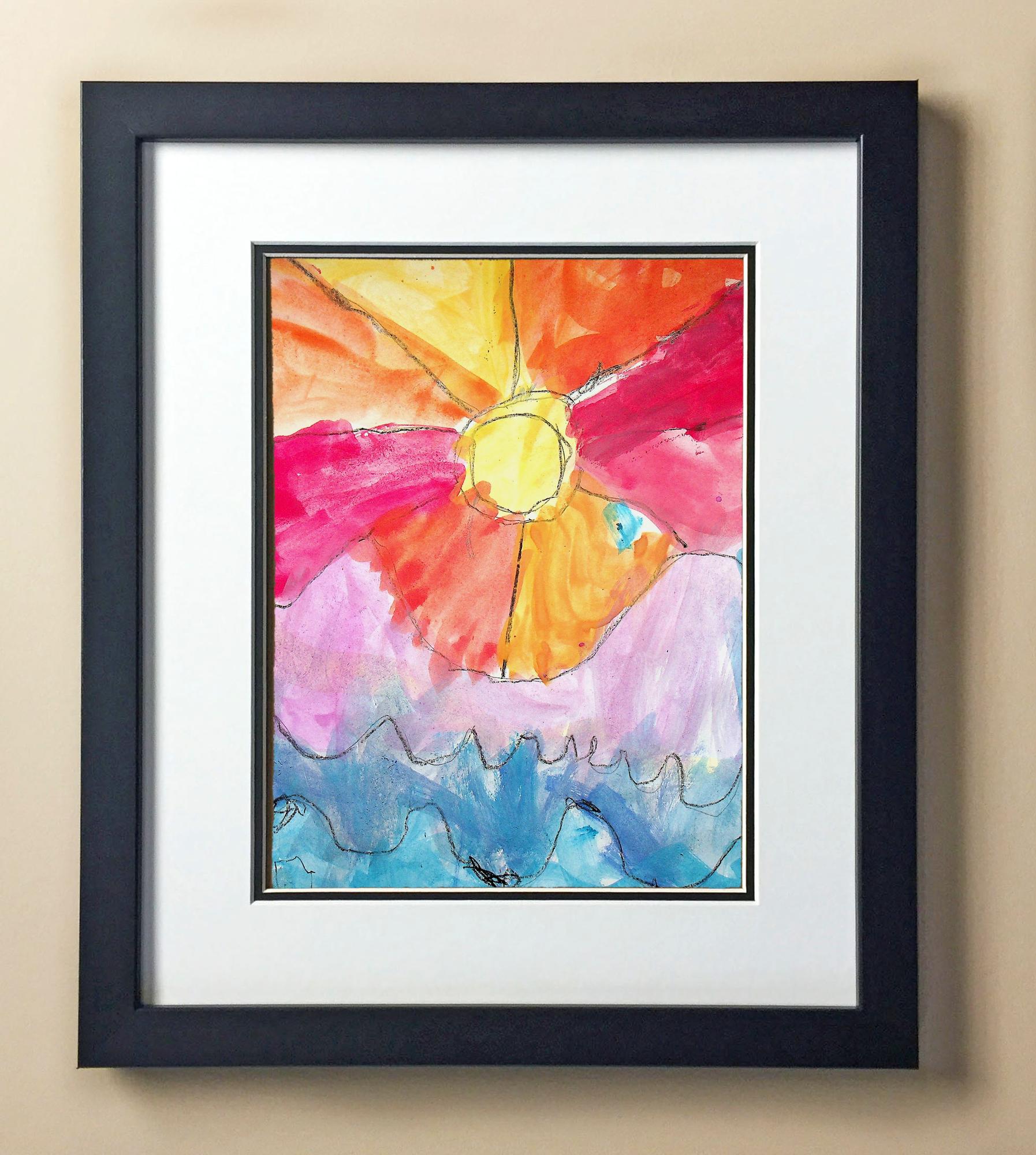 Included with the purchase is the Students Artwork, Frame, double matboard, shatter proof plexiglass, and a ready to hang backerboard with turnbuttons