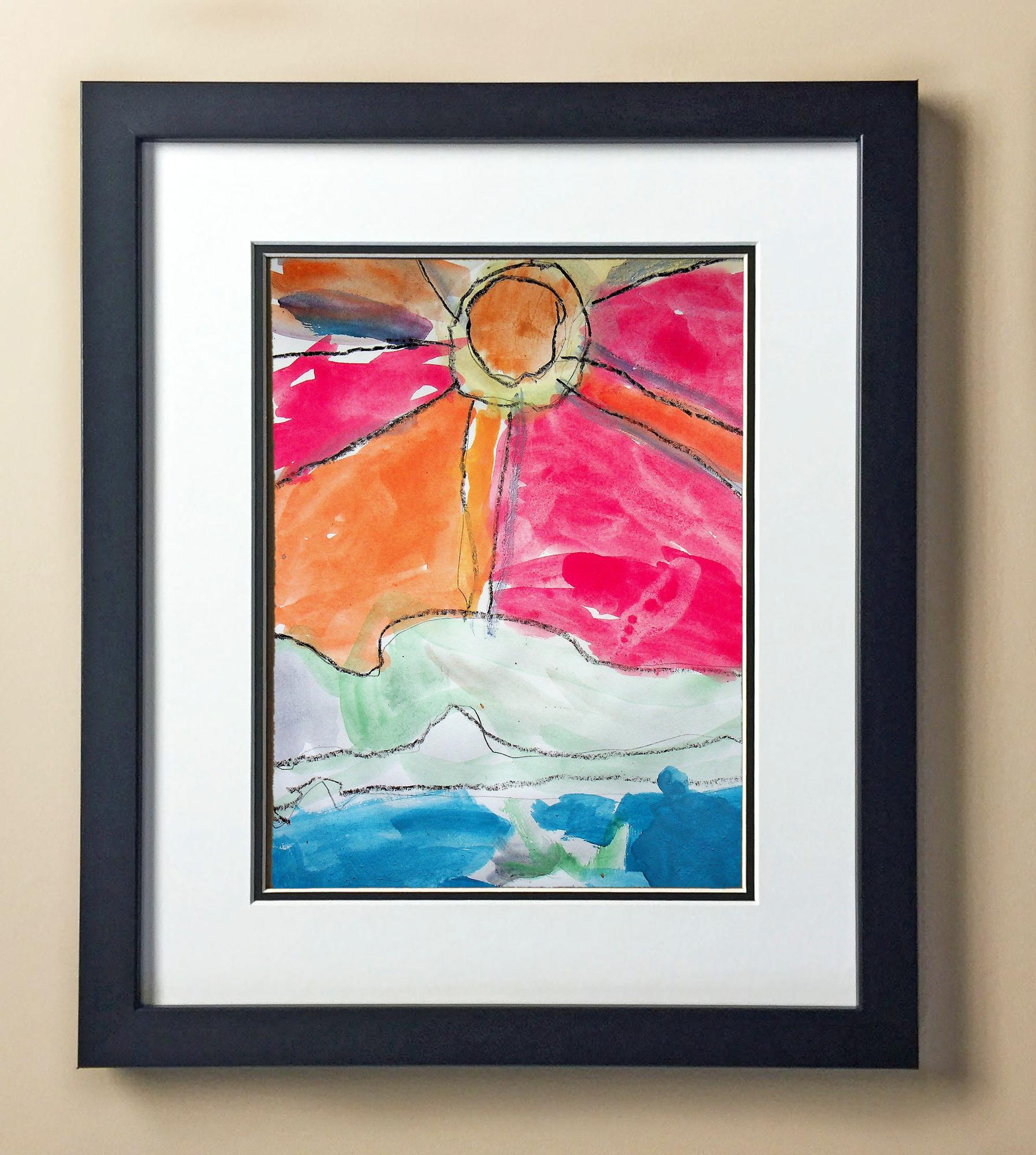 Included with the purchase is the Students Artwork, Frame, double matboard, shatter proof plexiglass, and a ready to hang backerboard with turnbuttons