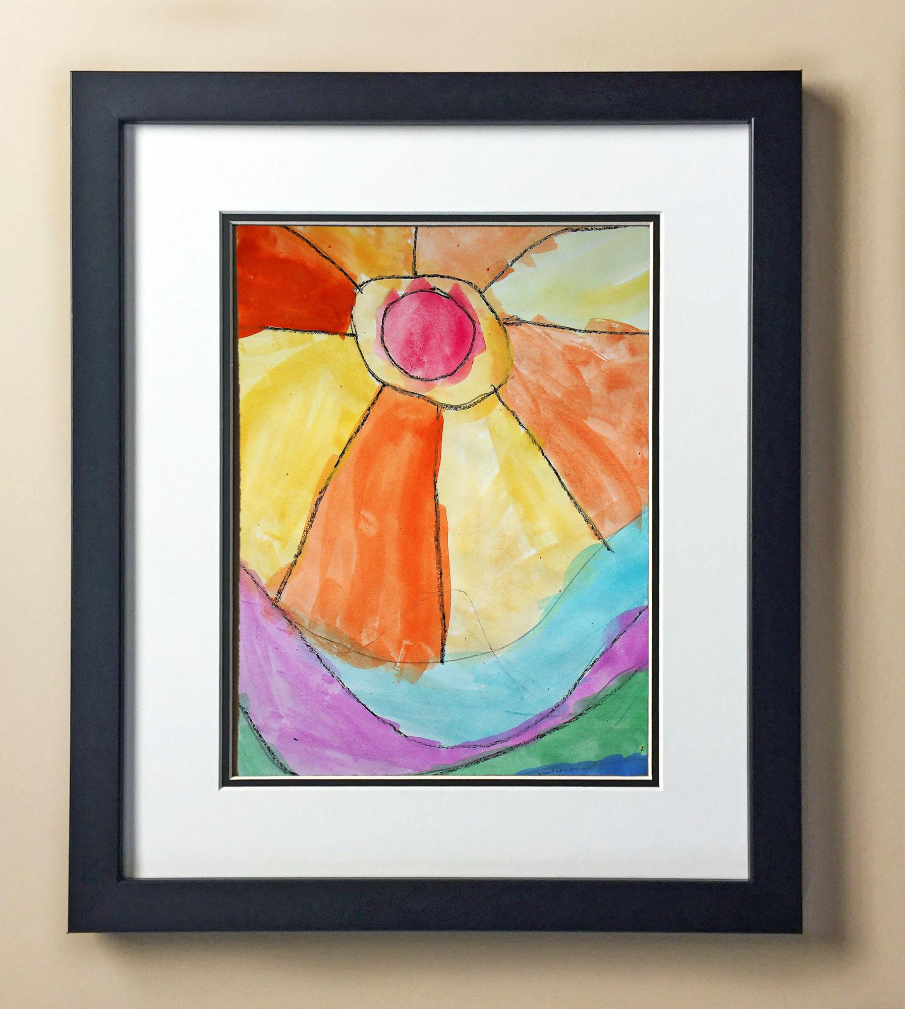 Included with the purchase is the Students Artwork, Frame, double matboard, shatter proof plexiglass, and a ready to hang backerboard with turnbuttons