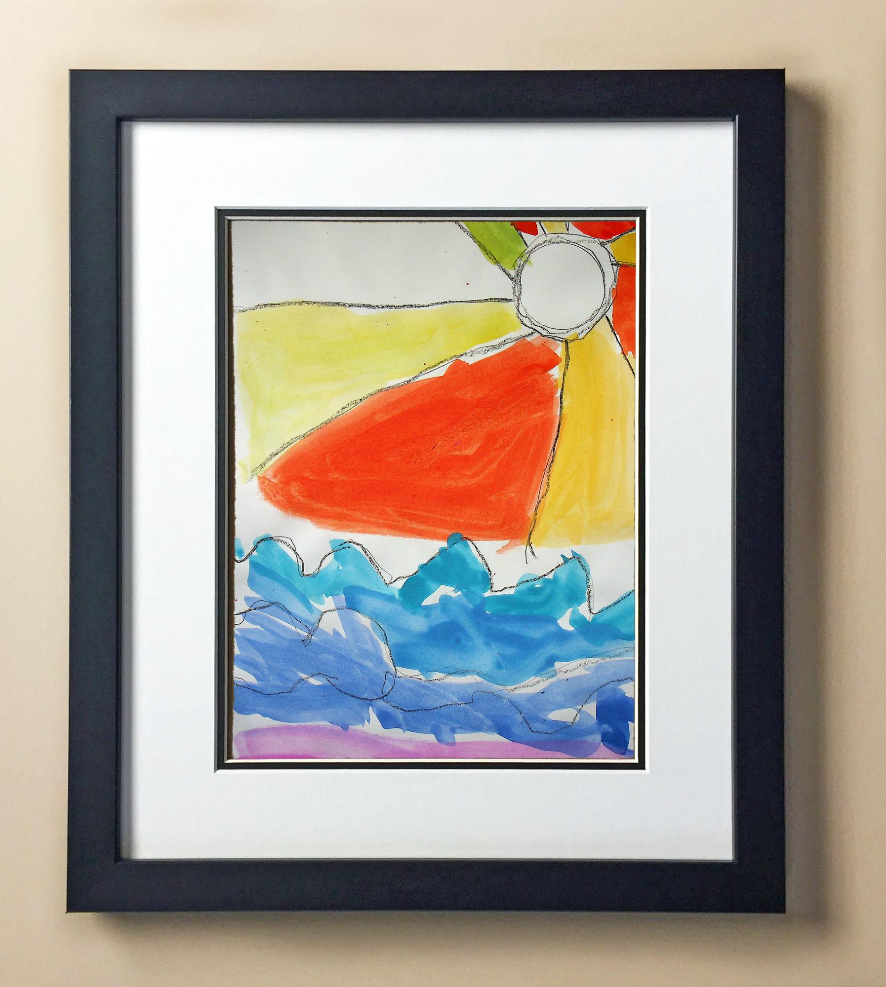 Included with the purchase is the Students Artwork, Frame, double matboard, shatter proof plexiglass, and a ready to hang backerboard with turnbuttons