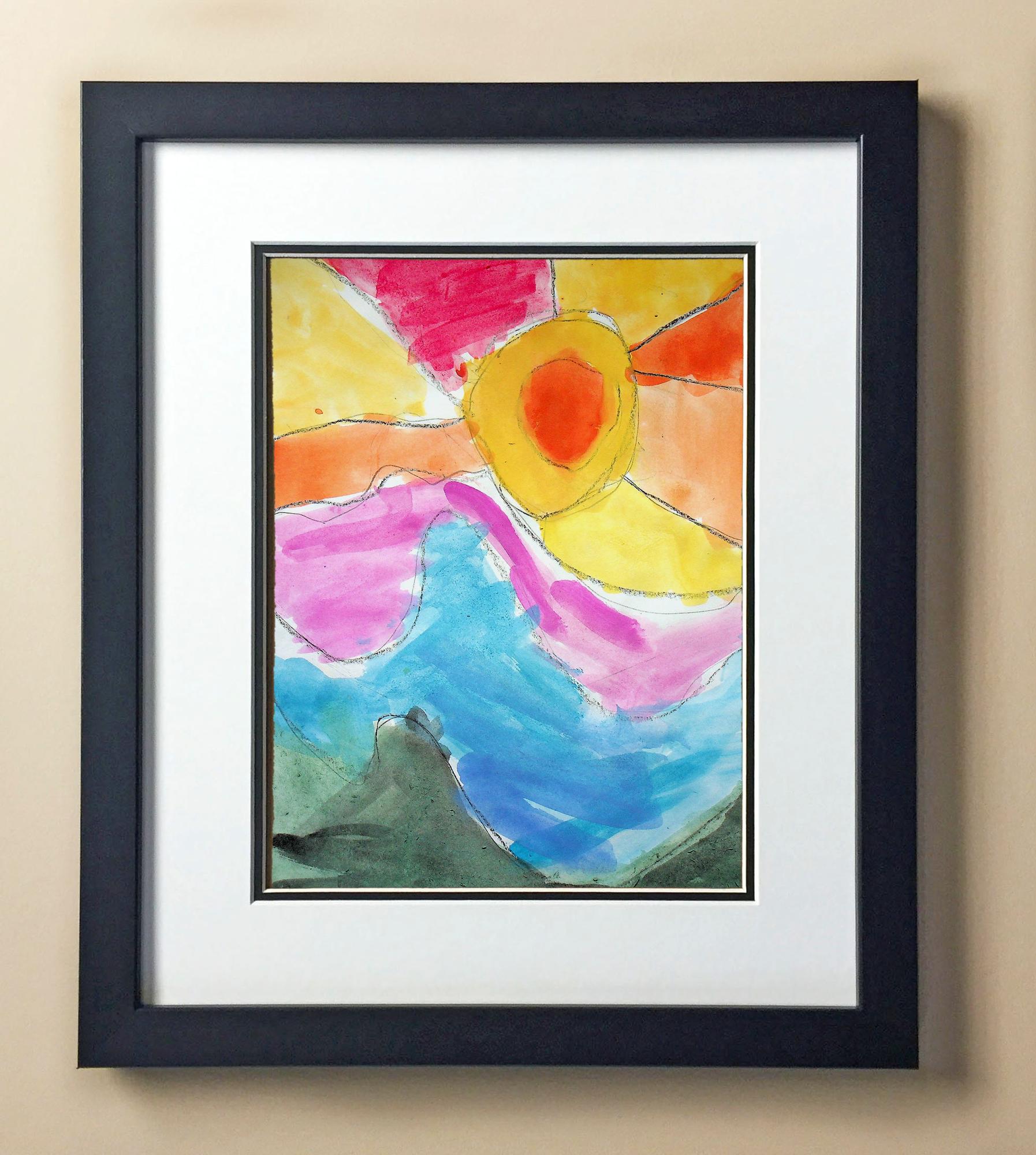 Included with the purchase is the Students Artwork, Frame, double matboard, shatter proof plexiglass, and a ready to hang backerboard with turnbuttons