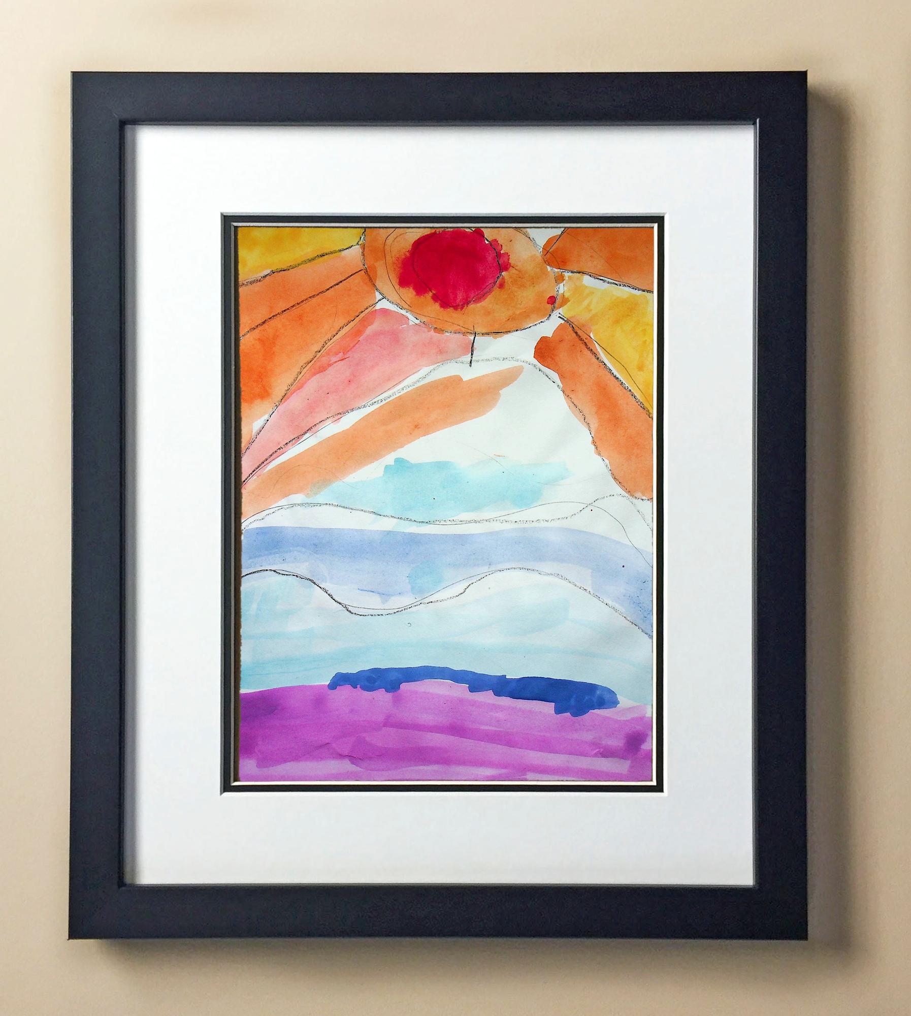 Included with the purchase is the Students Artwork, Frame, double matboard, shatter proof plexiglass, and a ready to hang backerboard with turnbuttons