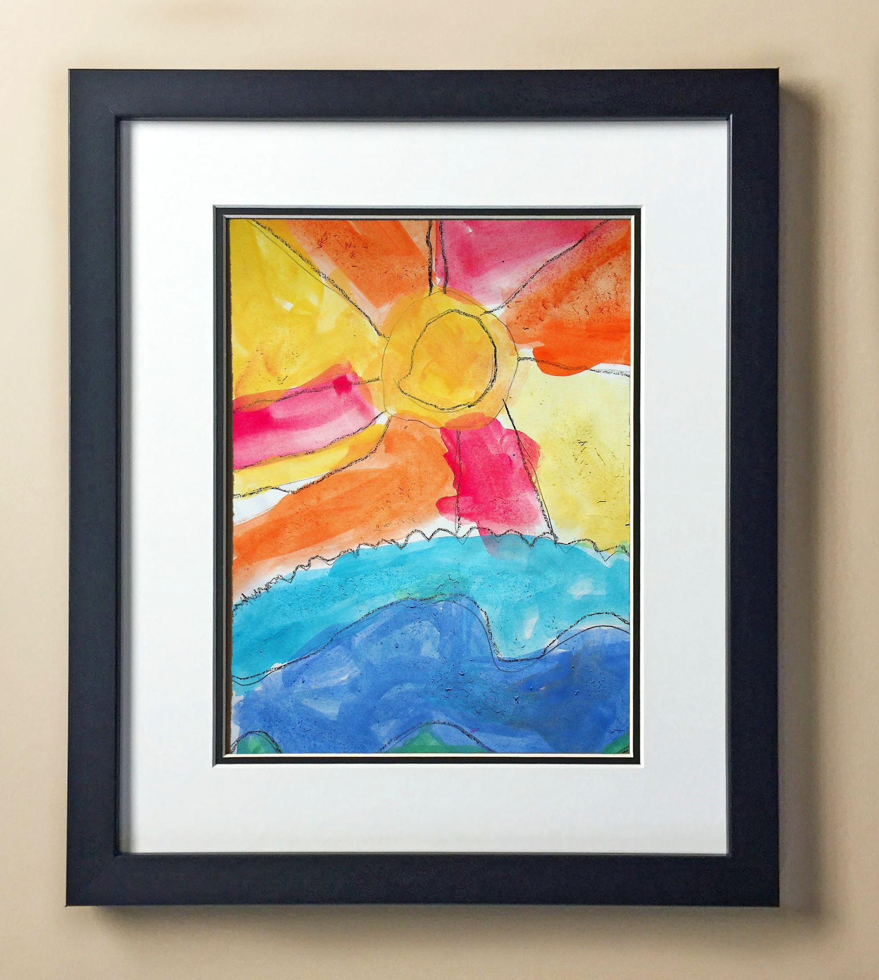 Included with the purchase is the Students Artwork, Frame, double matboard, shatter proof plexiglass, and a ready to hang backerboard with turnbuttons
