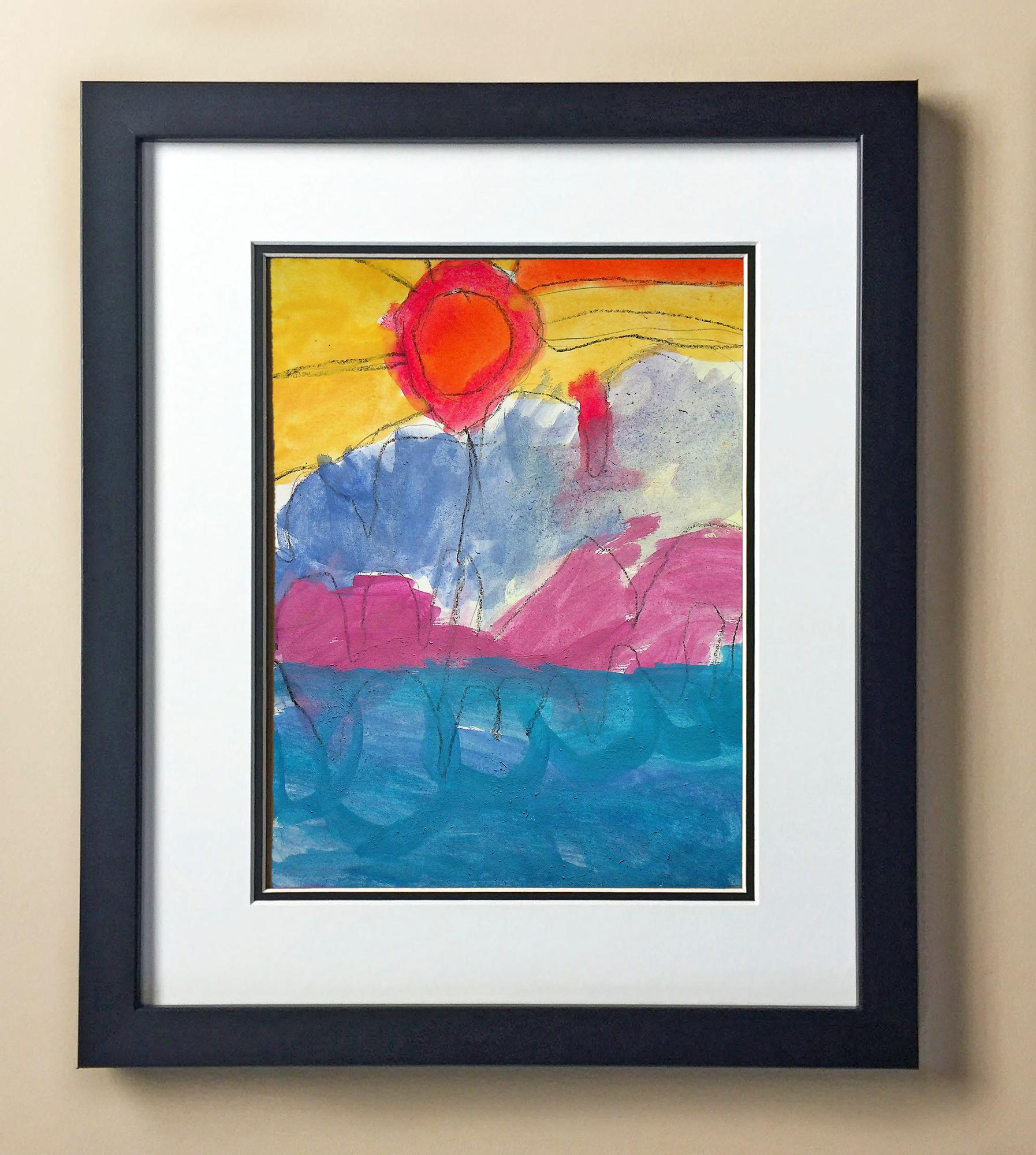 Included with the purchase is the Students Artwork, Frame, double matboard, shatter proof plexiglass, and a ready to hang backerboard with turnbuttons