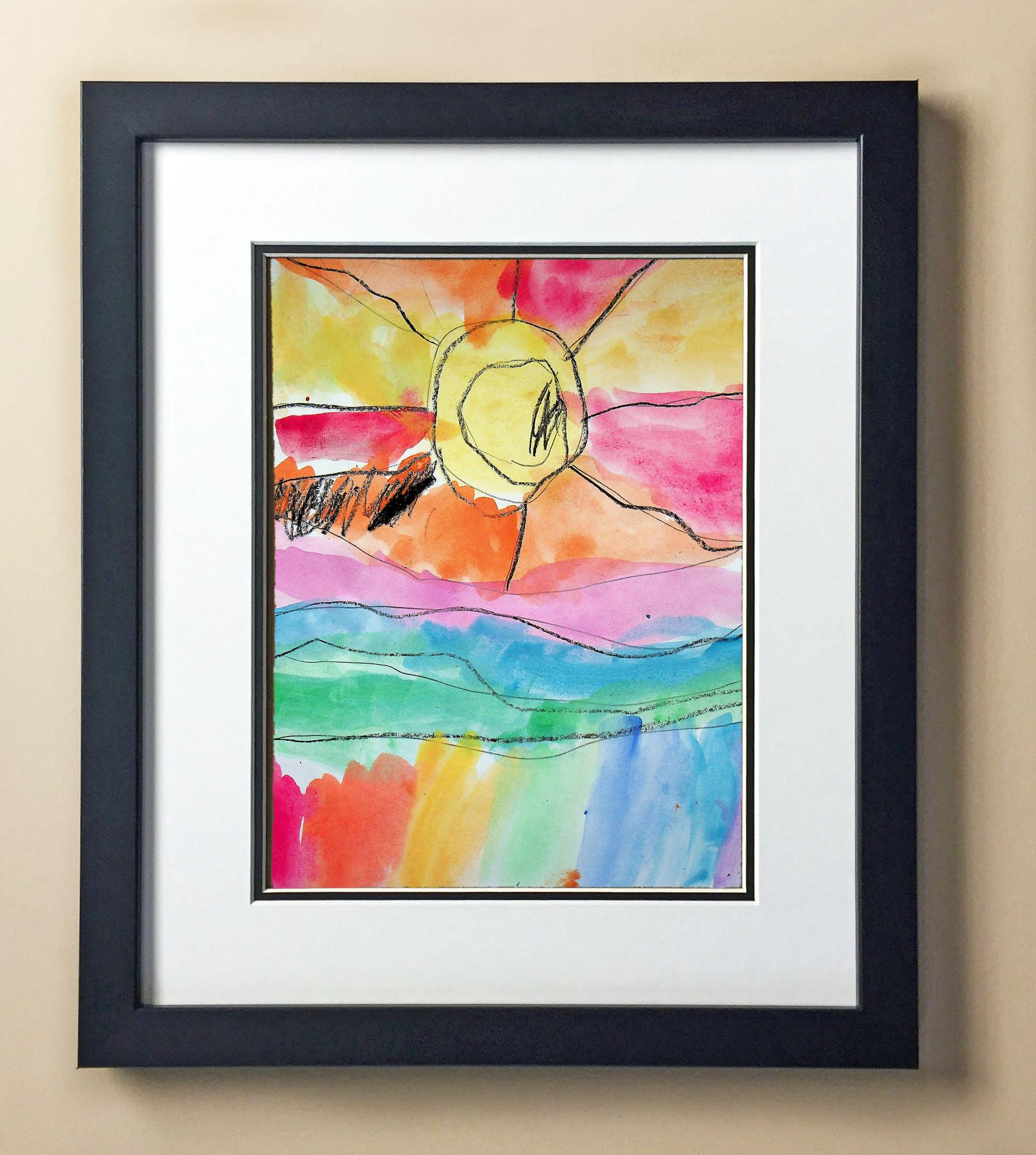 Included with the purchase is the Students Artwork, Frame, double matboard, shatter proof plexiglass, and a ready to hang backerboard with turnbuttons