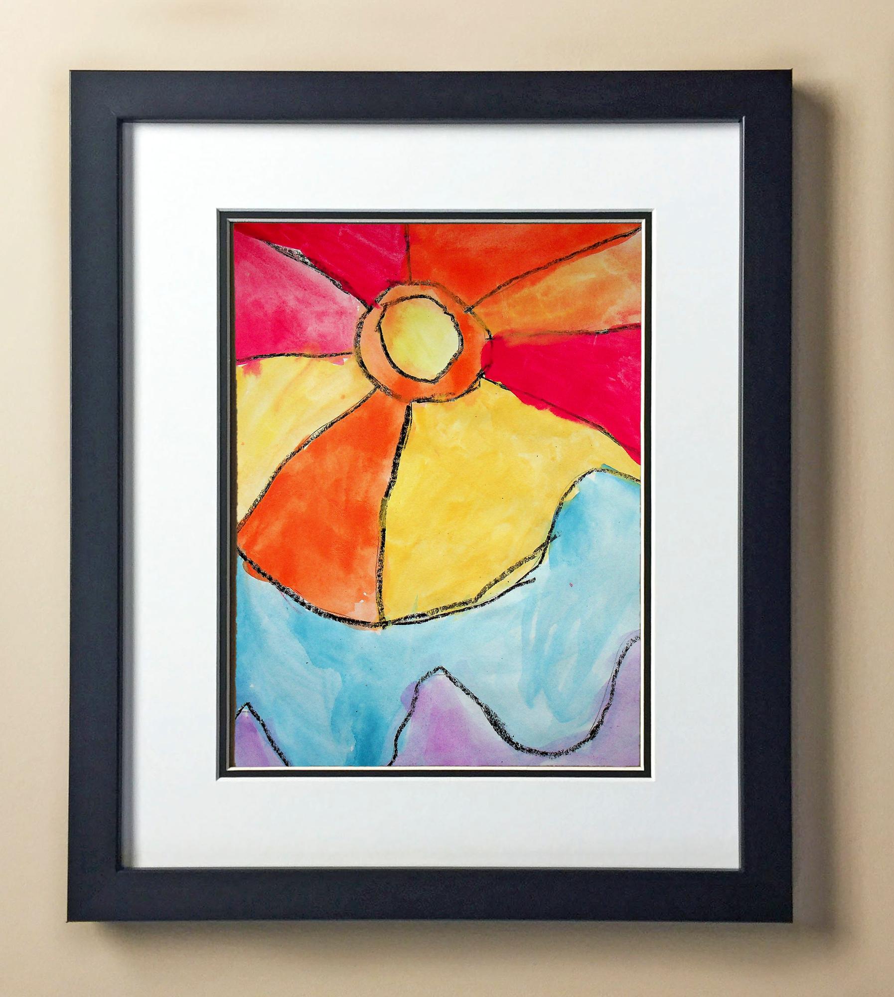 Included with the purchase is the Students Artwork, Frame, double matboard, shatter proof plexiglass, and a ready to hang backerboard with turnbuttons