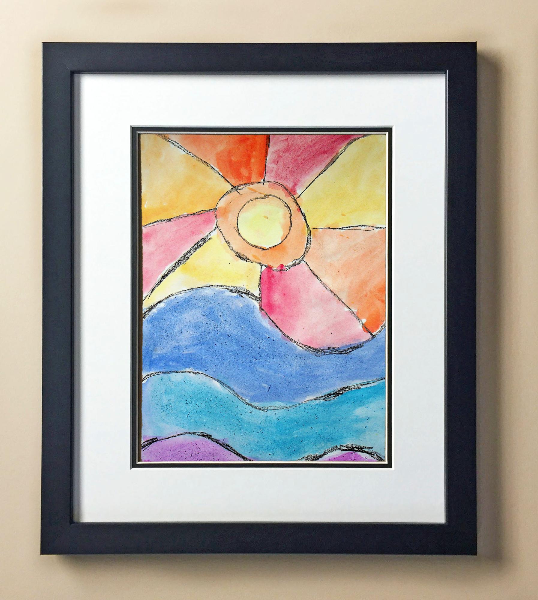 Included with the purchase is the Students Artwork, Frame, double matboard, shatter proof plexiglass, and a ready to hang backerboard with turnbuttons