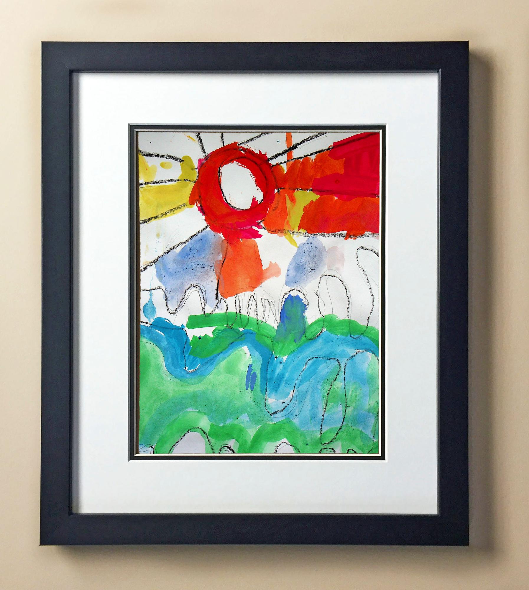 Included with the purchase is the Students Artwork, Frame, double matboard, shatter proof plexiglass, and a ready to hang backerboard with turnbuttons