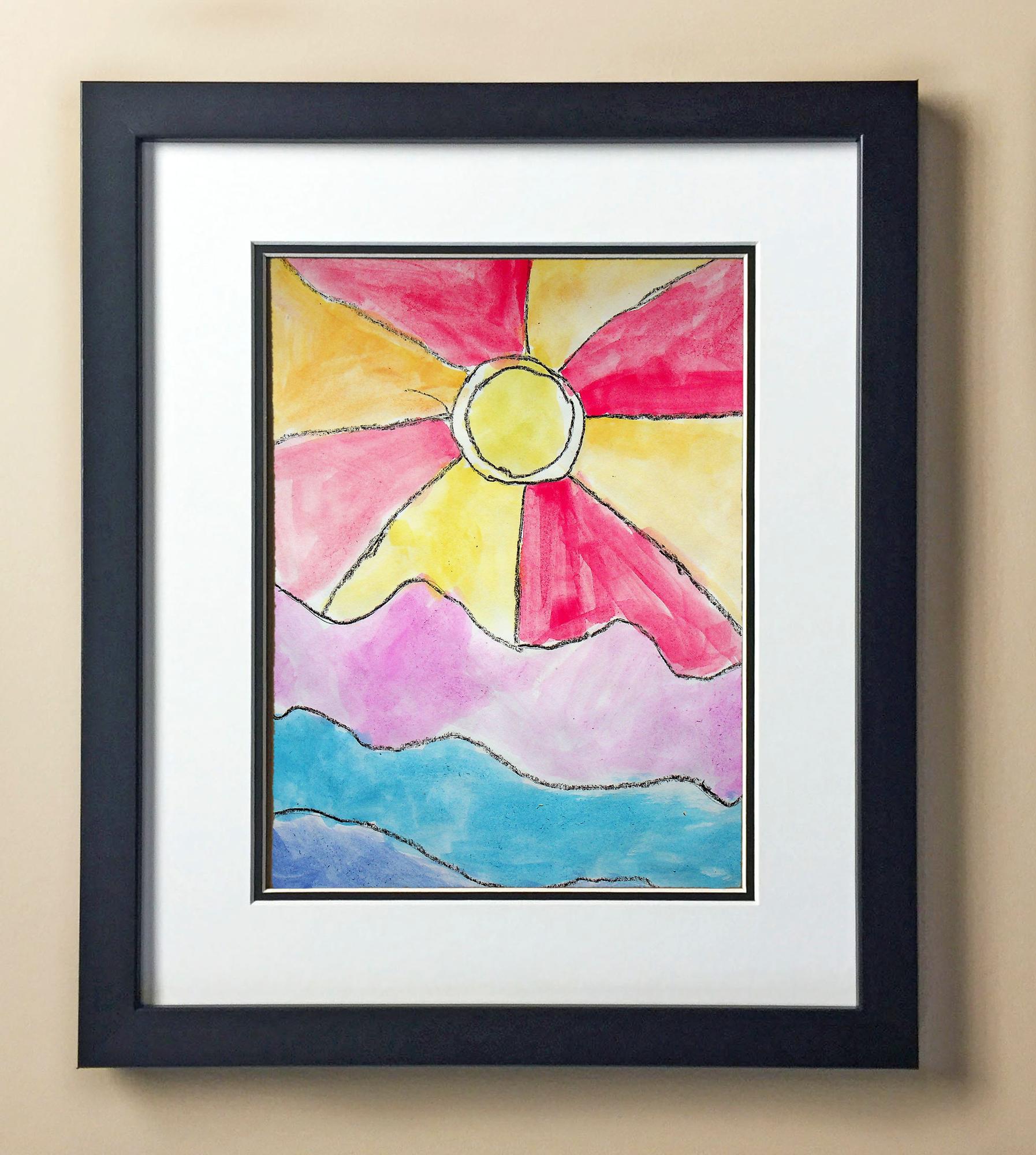 Included with the purchase is the Students Artwork, Frame, double matboard, shatter proof plexiglass, and a ready to hang backerboard with turnbuttons