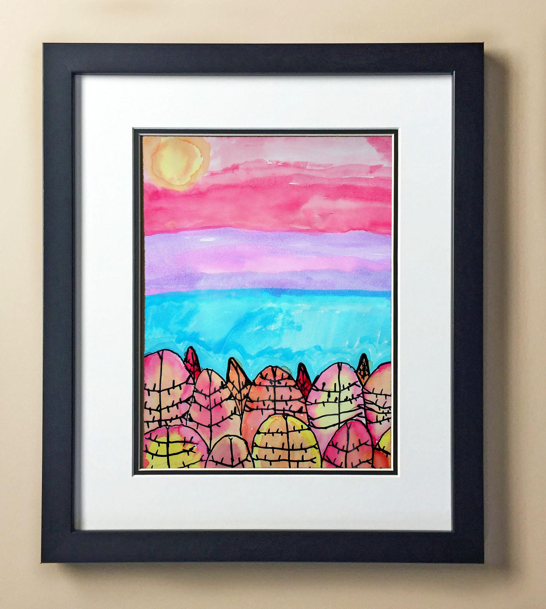 Included with the purchase is the Students Artwork, Frame, double matboard, shatter proof plexiglass, and a ready to hang backerboard with turnbuttons